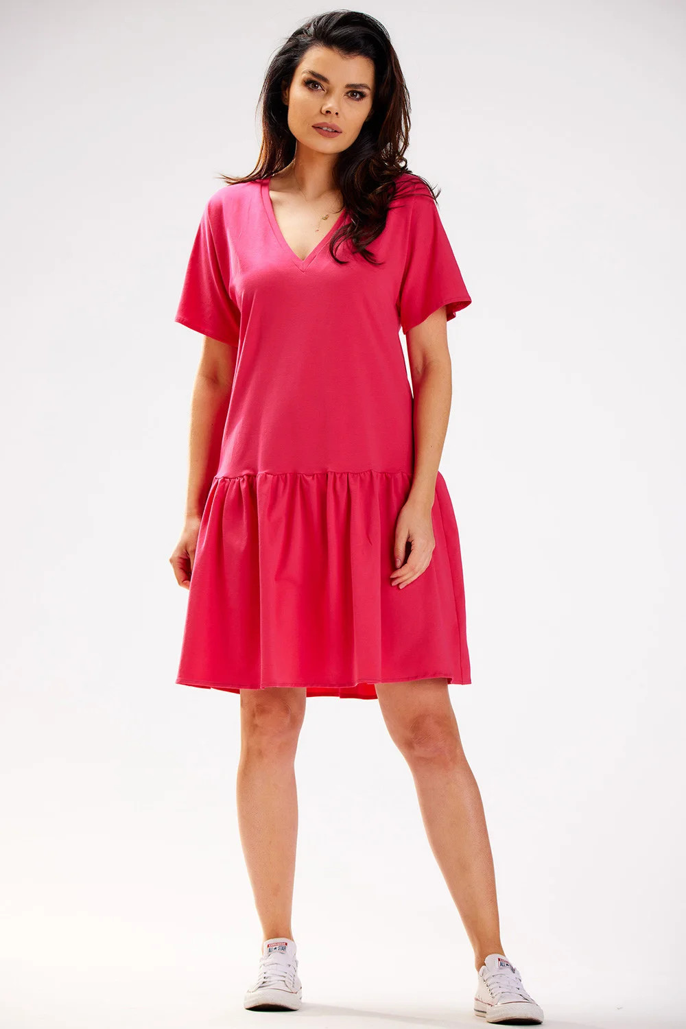 Šaty v ležérním stylu s krátkými rukávy a volánkem ve spodní části. Díky volnému střihu se budou pohodlně nosit v teplých dnech a krásné barvy jsou ideální pro každý odstín pleti a typ krásy, což zajistí dokonalý vzhled v každé situaci. Skvěle se hodí k letním sandálům i teniskám. Navrženo a ušito v Polsku.