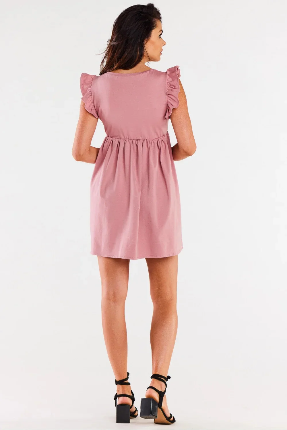 Letní šaty v délce mini. Střih s gumičkou pod prsy. Na ramenou jsou zdobené volánkem. Navrženo a ušito v Polsku.