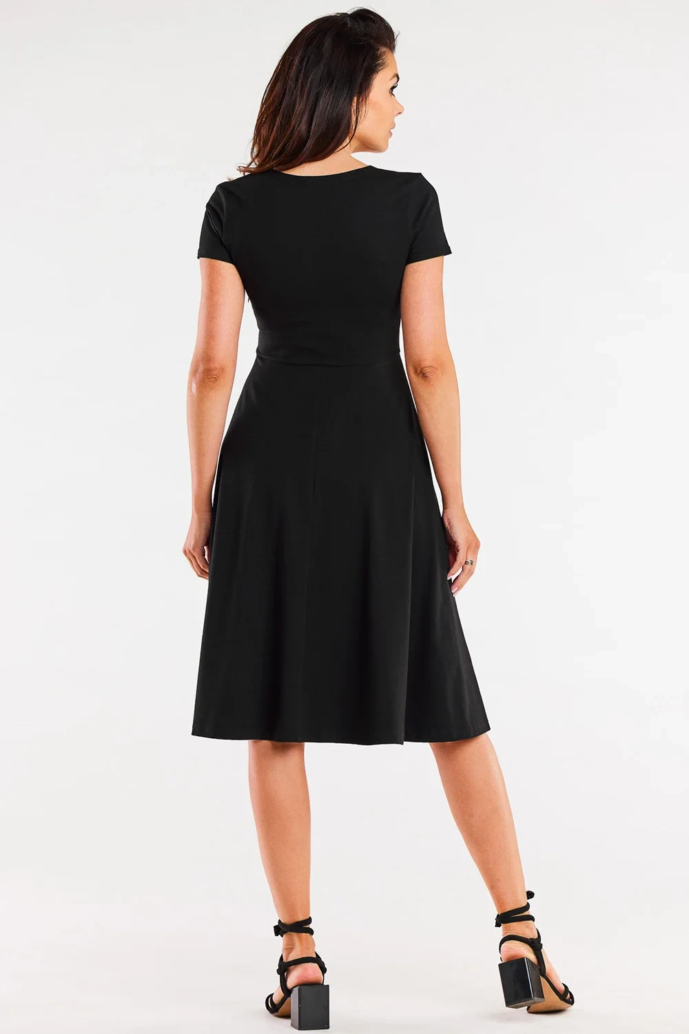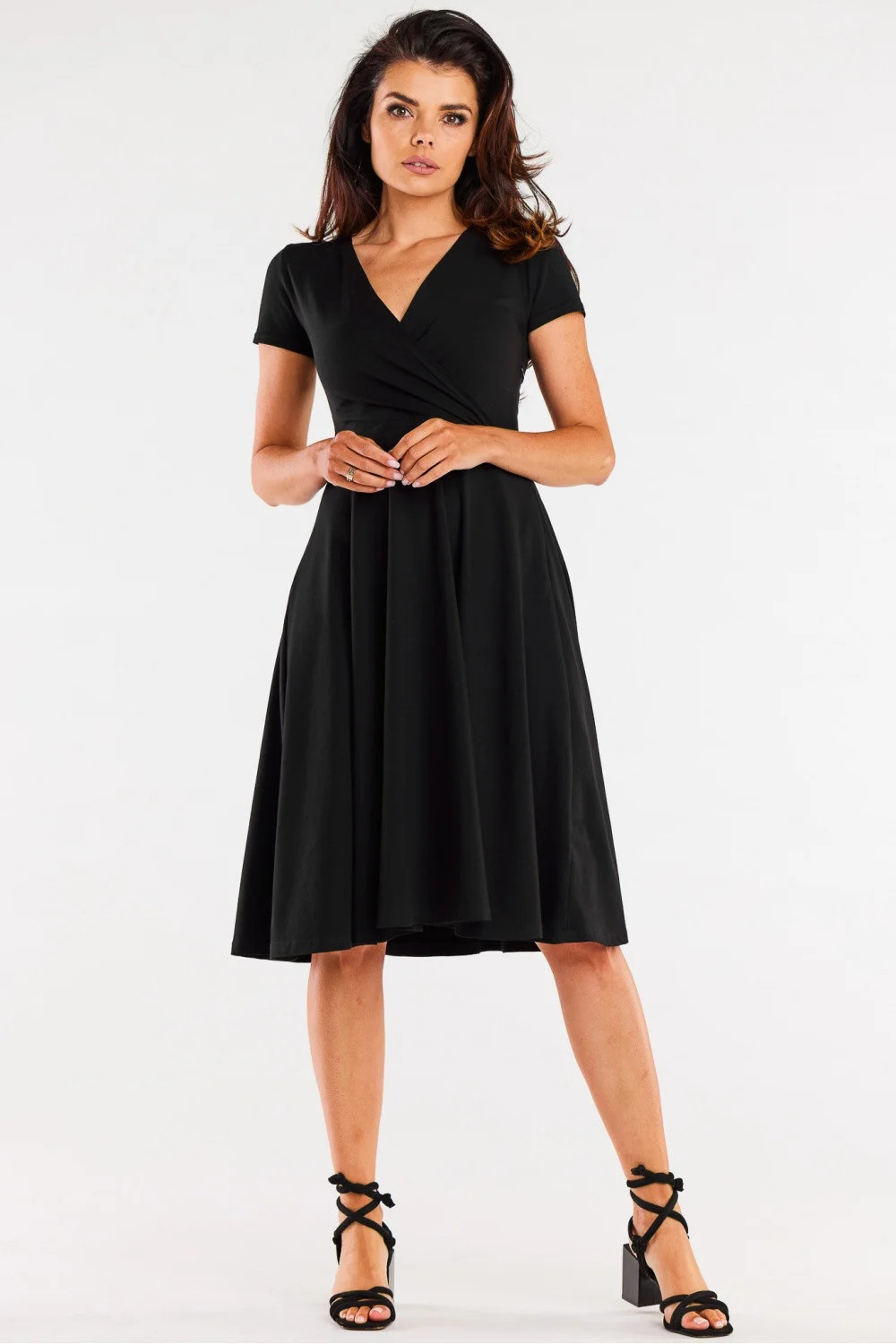 Midi šaty s krátkými rukávy a obálkovým výstřihem. Šaty krásně tvarují siluetu, zdůrazňují přednosti a zároveň zakrývají slabiny. Navrženo a ušito v Polsku.