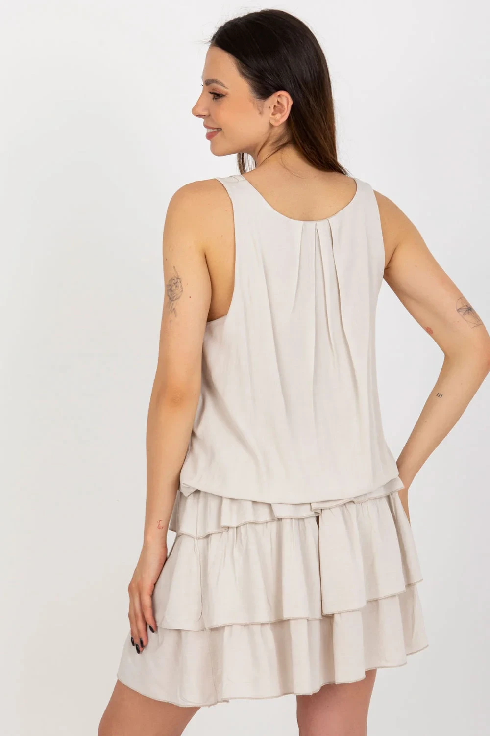 Letní šaty bez rukávů s kulatým výstřihem. Šaty s podšívkou, elastickým pasem a volánky.
