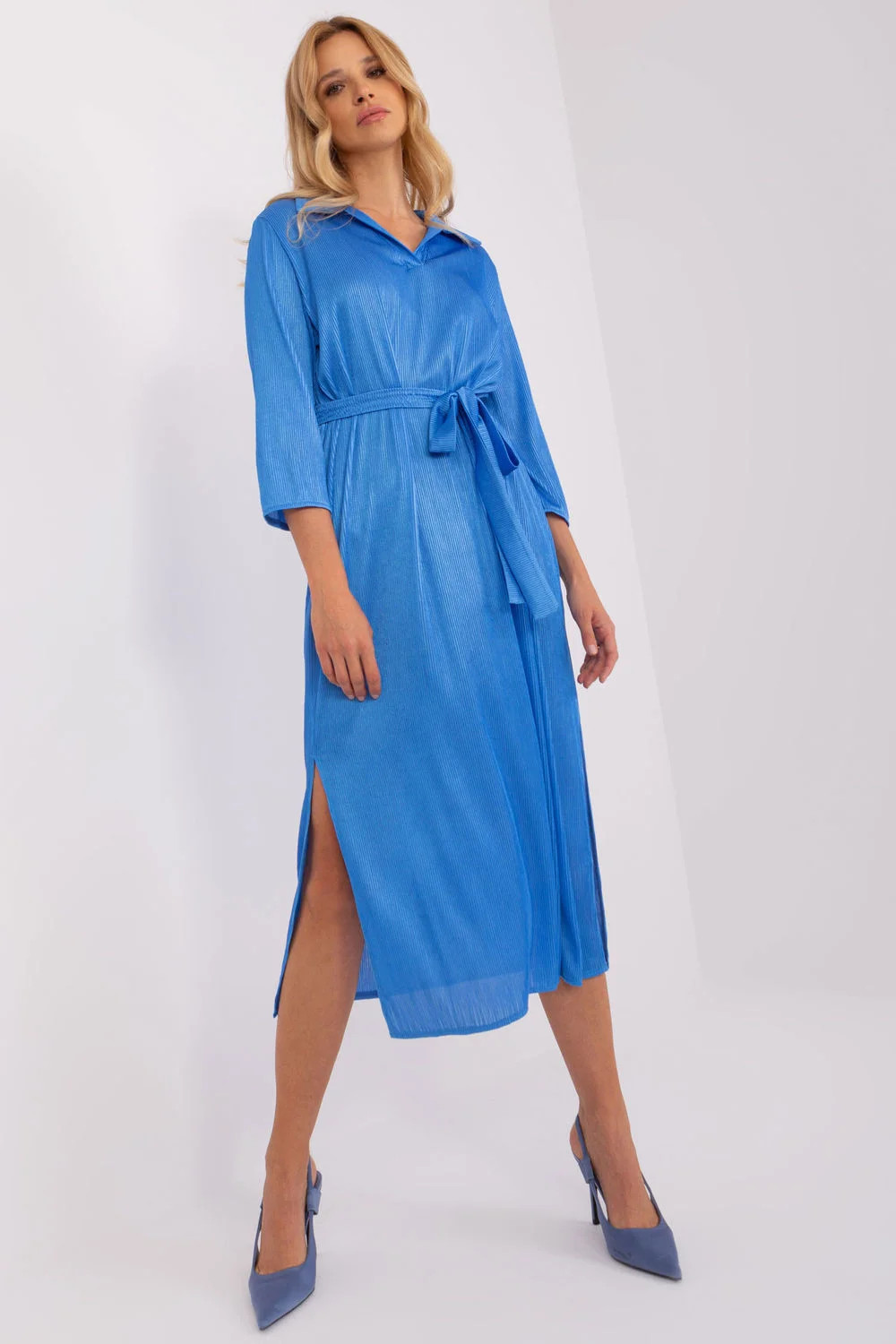 Šaty s 3/4 rukávy, límečkem a výstřihem do V. Zavazování v pase, dole rozparky. Šaty z žebrované tkaniny.