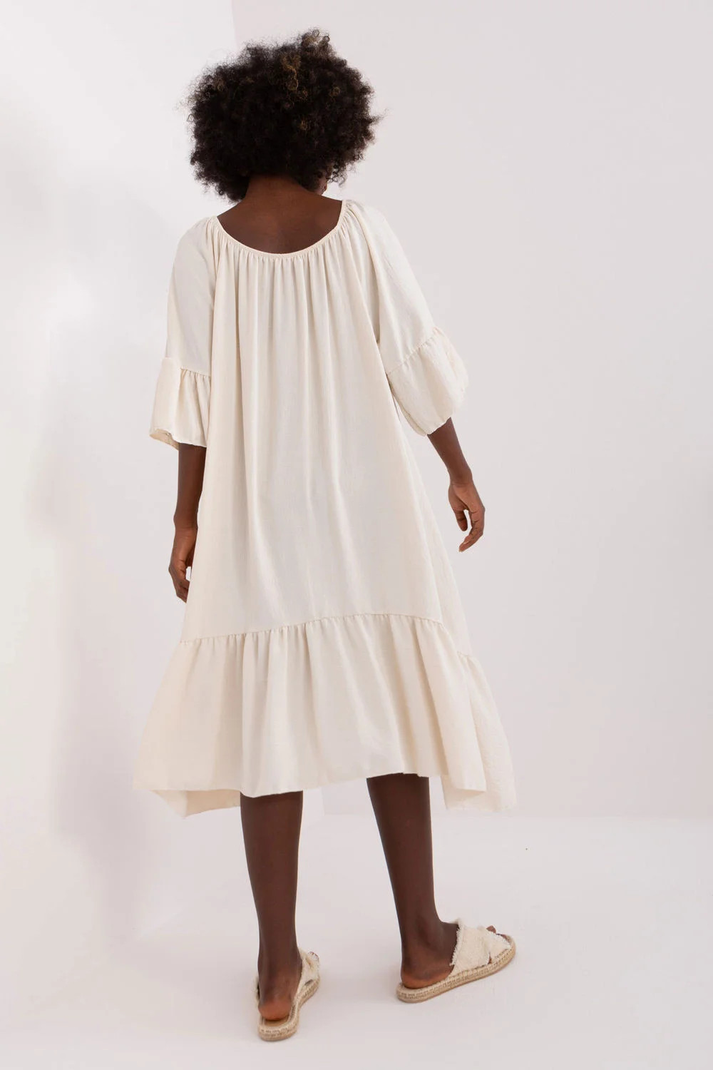 Volné letní šaty s 3/4 rukávy a kulatým výstřihem. Rukávy a spodní část šatů jsou zakončeny volánkem.