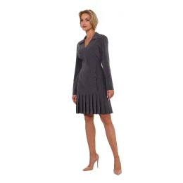 Šaty s dlouhými rukávy, límečkem a výstřihem do V. Šaty jsou v pase přestřižené a vpředu se zapínají na ozdobné knoflíky. Šaty jsou bez podšívky a zapínají se na krytý zip. Ozdobné řasení ve spodní části. Navrženo a ušito v Polsku.