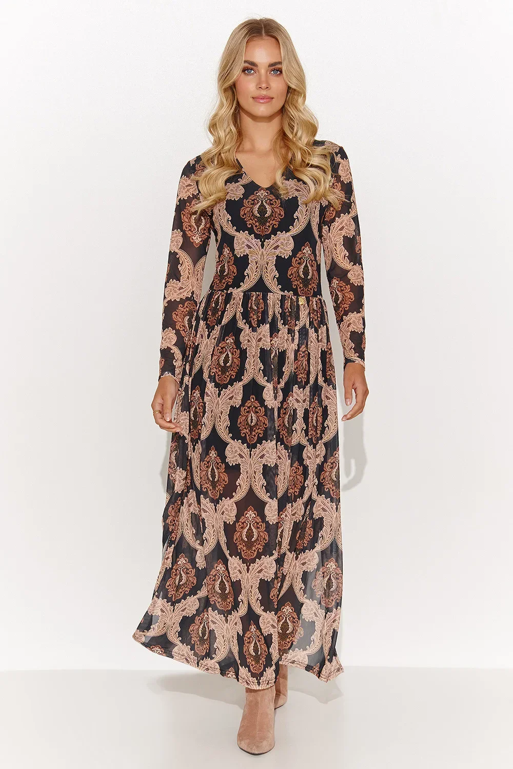 Jedinečné dlouhé šaty z lehké tkaniny nesmí chybět ve vašem šatníku. Trojúhelníkový výstřih a dlouhé rukávy dodávají šatům ležérní styl a praktické každodenní využití. Boční rozparky naopak dodávají šatům lehkost. Důležitým prvkem je všitá viskózová podšívka, která diskrétně zakrývá strategická místa. Vnější materiál je z poloviny průhledný, s potisky. Kreace je k dispozici v pěti variantách, které se liší barvou a vzorem. Každá z nich je ideální kombinací s kozačkami nebo lodičkami a elegantním kabátem. Tyto šaty vám dodají pocit jedinečnosti a hodí se pro mnoho příležitostí, od romantické večeře až po spontánní procházku městem.