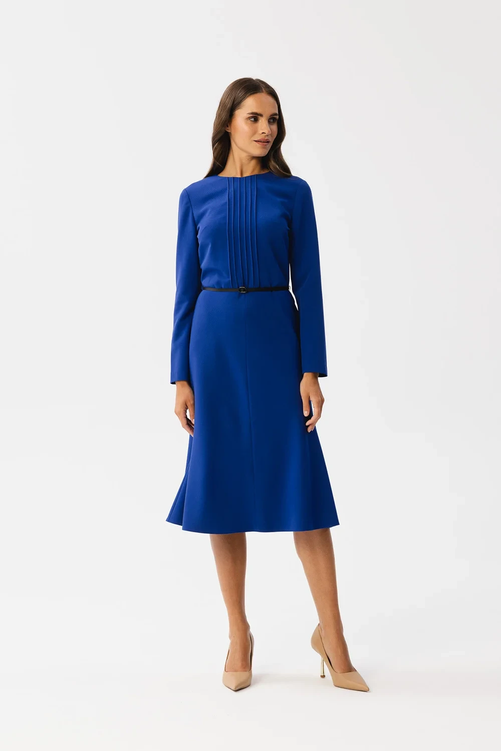Tyto šaty vynikají ozdobným prošíváním ve výstřihu, které jim dodává na půvabu. Přestřižení v pase zvýrazňuje pas a přiložený pásek z umělé kůže je stylovým doplňkem. Dlouhé rovné rukávy jsou univerzální a módní. Spodní část šatů je střižena se šikmým lemem s prošitím uprostřed pro odlehčený vzhled. Díky délce pod kolena jsou šaty vhodné pro mnoho příležitostí. Krytý zip na zádech usnadňuje oblékání. Šaty jsou bez podšívky pro pohodlné nošení. Jedná se o šaty, které byly navrženy a ušity v Polsku, což svědčí o jejich kvalitě a jedinečnosti. Dodají vám sebevědomí a styl pro různé příležitosti.