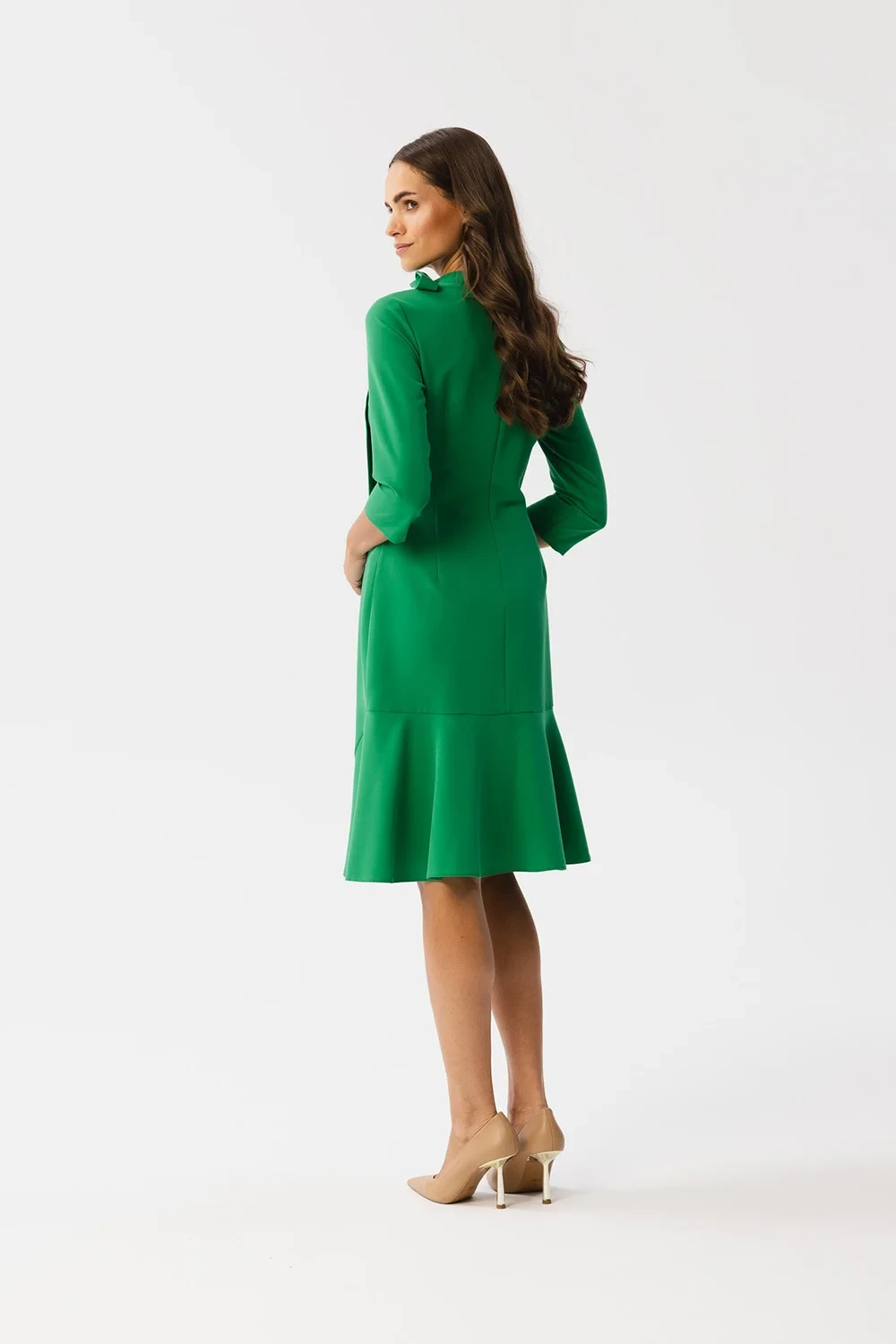 Tyto krásné šaty s ozdobnými kosticemi a stojáčkem jsou ideální volbou pro mnoho příležitostí. Tříčtvrteční rukávy dodávají šatům lehkost a délka ke kolenům je činí univerzálními. Na zádech je volánek, který jim dodává na půvabu. Šaty jsou bez podšívky, ale díky krytému zipu na zádech se snadno oblékají. Tyto šaty byly navrženy a ušity v Polsku, což svědčí o jejich kvalitě a jedinečnosti. Dodají vám sebevědomí a styl pro nejrůznější příležitosti.
