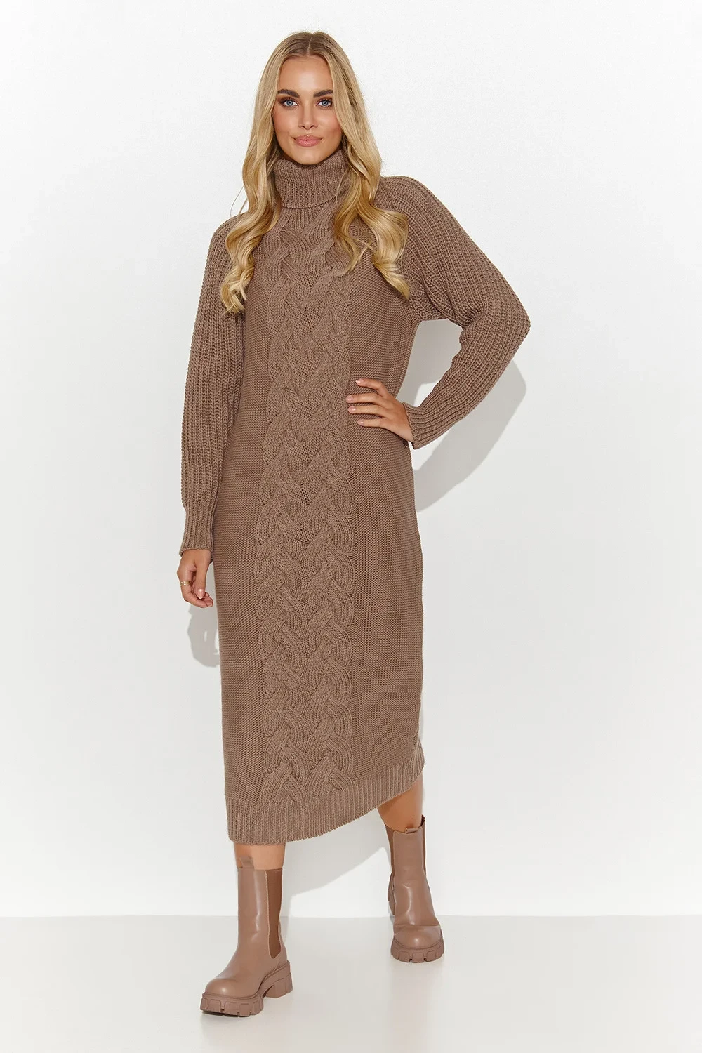 Tyto svetrové šaty ke kolenům jsou kombinací pohodlí a noblesy v jednom. Dlouhé ležérní rukávy a rolák poskytují příjemné teplo, ideální pro chladnější dny. Prodloužený střih za kolena dodává šatům eleganci a zároveň umožňuje jejich neformální nošení pro běžné i pracovní nošení. Výrazná kostkovaná vazba umístěná uprostřed předního dílu dodává šatům jedinečný nádech a podtrhuje jejich jedinečný design. Hladká zadní část šatů naopak zajišťuje zachování rovnováhy. Šaty jsou k dispozici v okouzlujících barvách cappuccino, béžové, krémové, černé a čokoládové. V kombinaci s kozačkami vytvoříte trendy a pohodlný vzhled na podzim a zimu. Můžete je také nosit s teniskami na ležérnější výlety. Díky své univerzálnosti je ideální volbou pro aktivní ženy, které ocení módní a pohodlný vzhled.