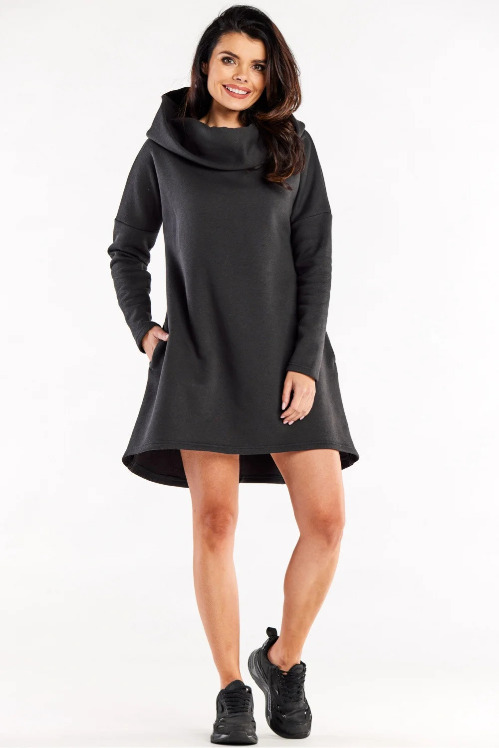 Volné trapézové šaty s dlouhými rukávy a kapucí, s kapsami v bočních švech. Perfektní návrh na každodenní nošení.