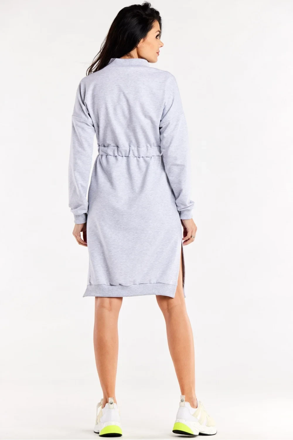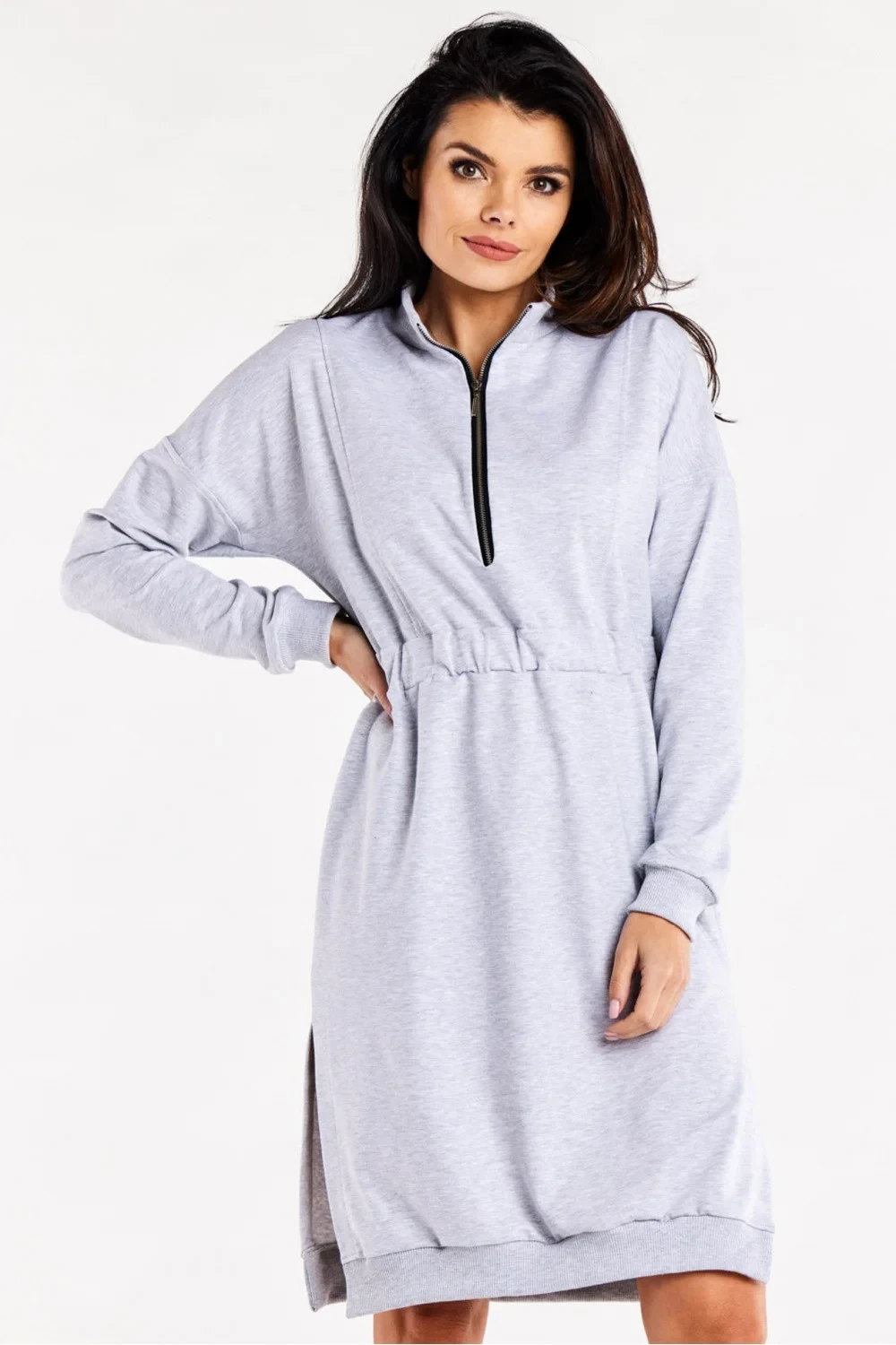 Šaty s dlouhými rukávy, ozdobnými bočními rozparky a svislými švy na přední straně. V pase je všitá guma pro přiléhavý střih. Šaty mají zapínání na zip ve výstřihu.