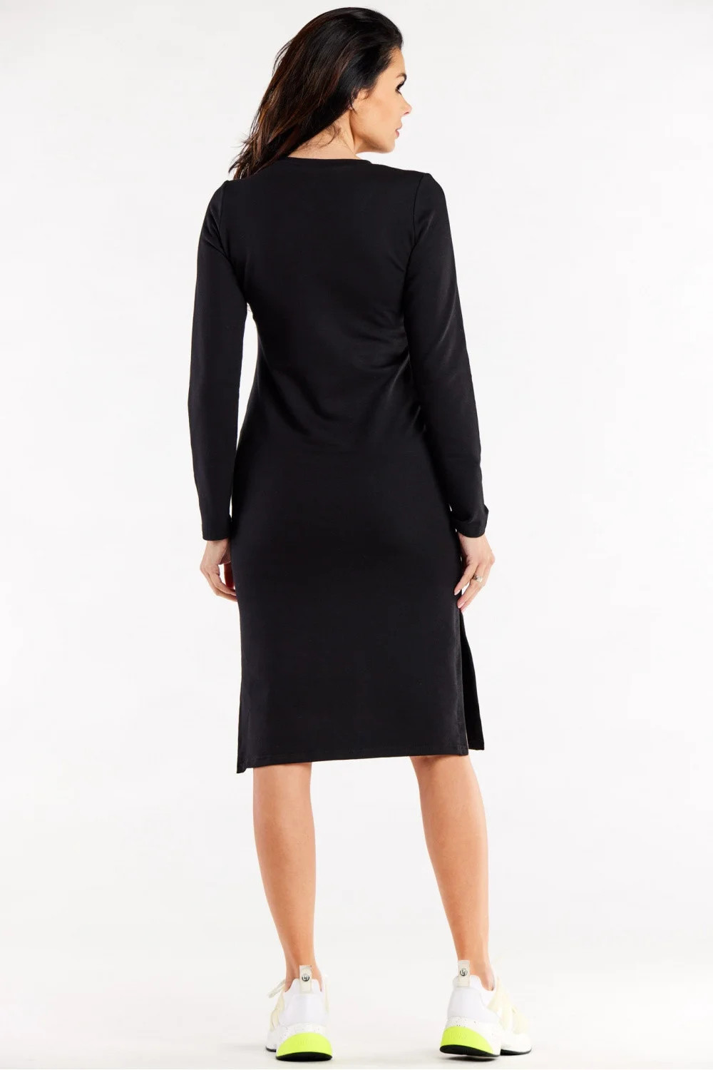 Přiléhavé šaty s dlouhými rukávy a rozparky na bocích. Šaty mají véčkový výstřih a ozdobné našité kapsy.