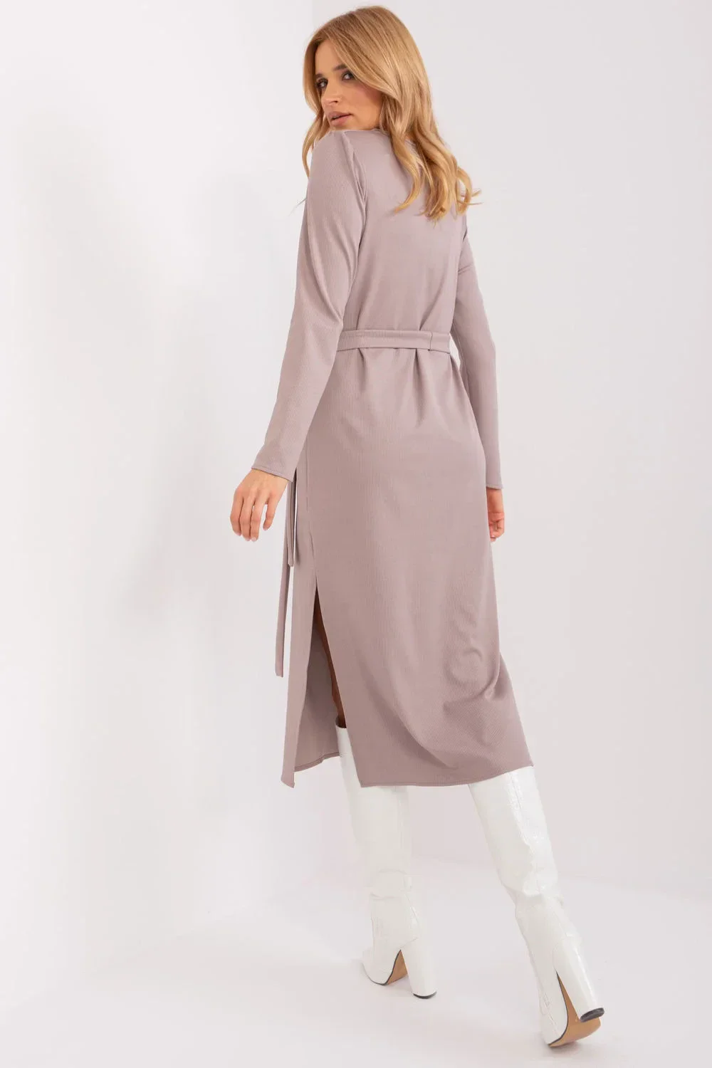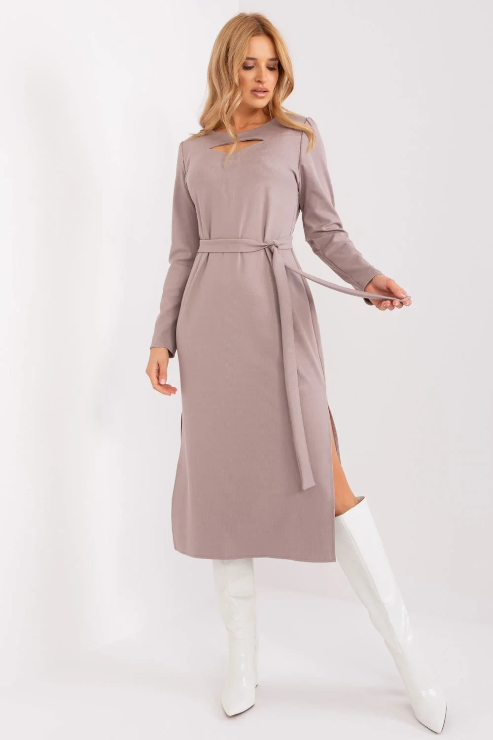 Tyto elegantní šaty rovného střihu se hodí k různým příležitostem. Díky klasickému střihu se hodí jak na pracovní schůzky, tak na formálnější výlety. Šaty jsou vyrobeny z látky s pestrou žebrovanou strukturou, která jim dodává jemný nádech. Dlouhé rukávy a kulatý výstřih s průstřihem dodávají šatům jedinečný vzhled, zatímco dodatečný pásek na zavázání zvýrazňuje pas. Díky midi délce jsou šaty pohodlnou volbou pro všechna roční období.