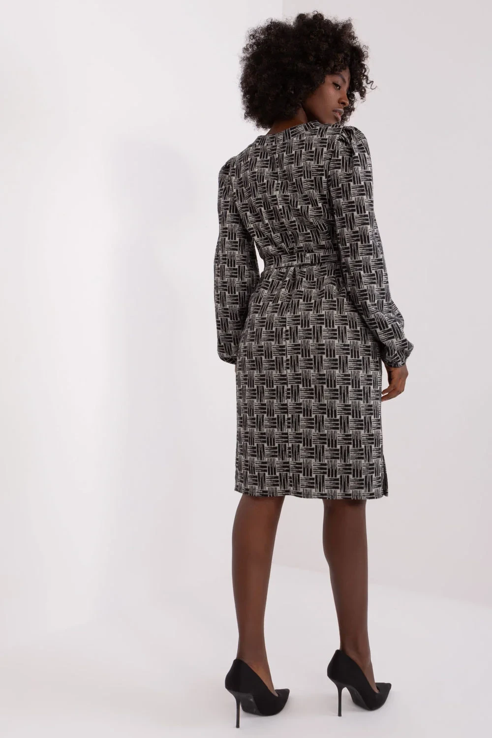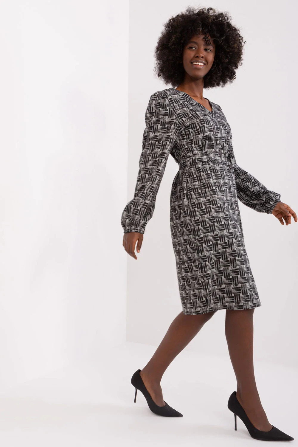 Šaty rovného střihu s bufetovými rukávy a výstřihem do V. Šaty z látky s geometrickým vzorem, doplněné páskem na zavázání.