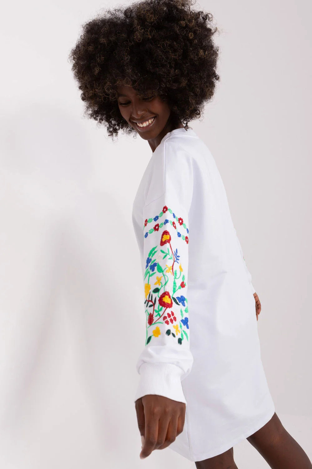 Teplákové šaty s kulatým výstřihem a dlouhými rukávy. Rukávy zdobí zajímavá výšivka po celé délce. Kapsy v bočních švech. Ideální pro mnoho příležitostí.