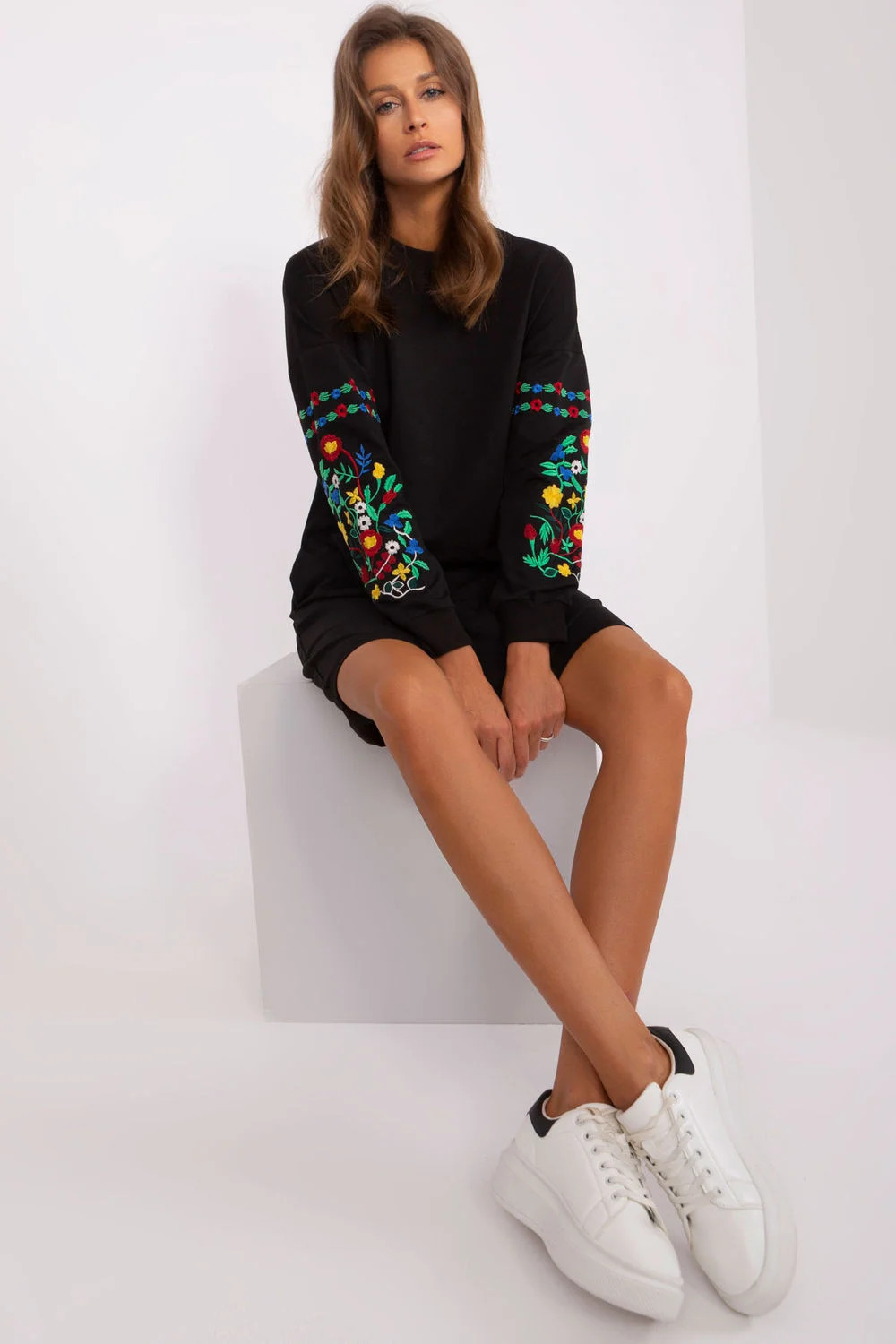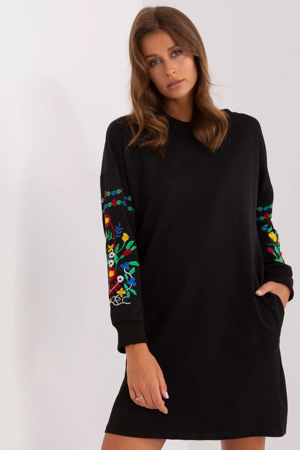 Teplákové šaty s kulatým výstřihem a dlouhými rukávy. Rukávy zdobí zajímavá výšivka po celé délce. Kapsy v bočních švech. Ideální pro mnoho příležitostí.