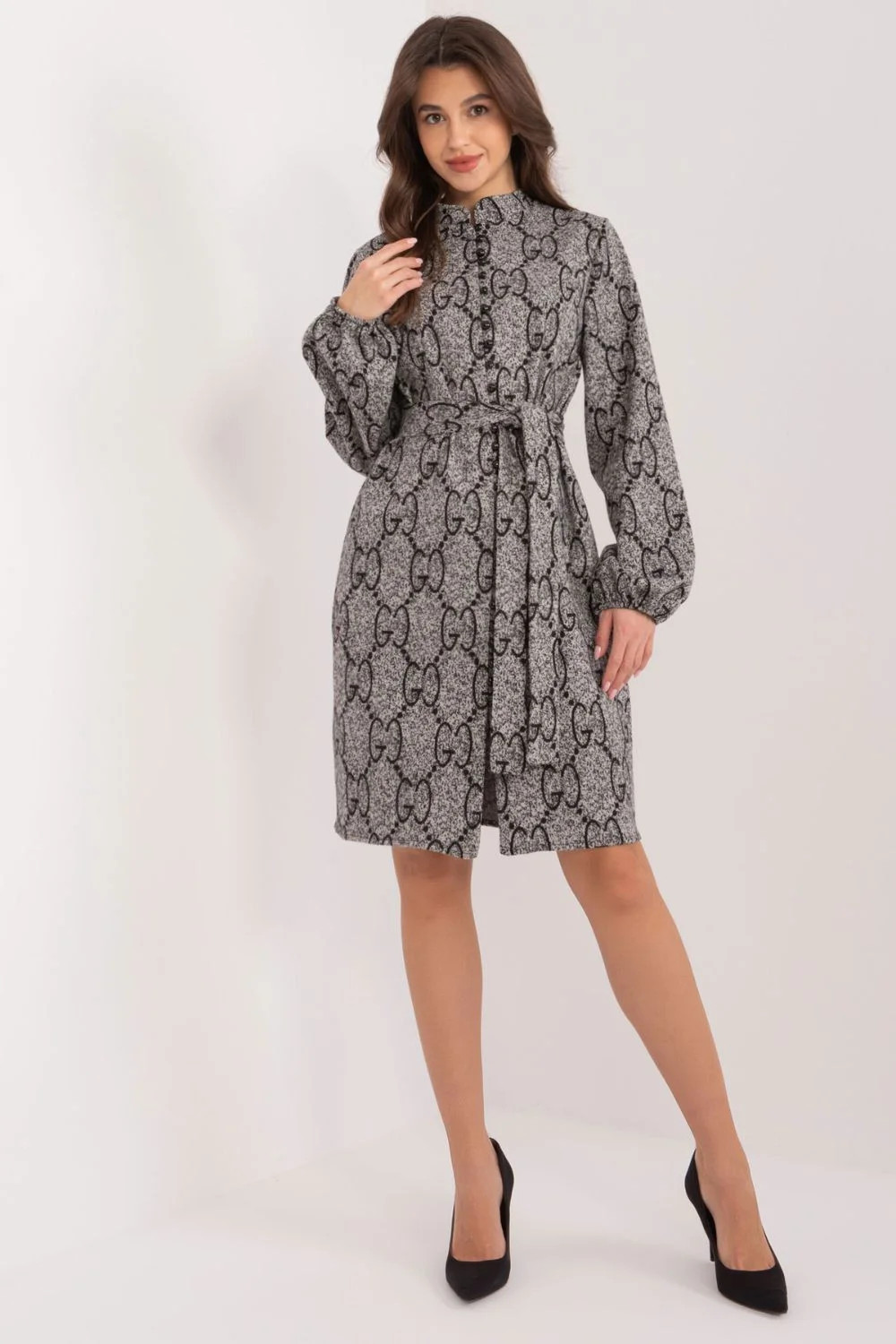 Vzorované pletené šaty jsou ideální volbou pro ženy, které chtějí spojit eleganci s pohodlím. Díky jednoduchému střihu a použití pleteniny jsou tyto šaty nejen stylové, ale také pohodlné, ideální pro různé příležitosti, od práce až po slavnostní setkání. Dlouhý rukáv a stojáček dodávají šatům eleganci a zároveň chrání před chladem. Pouzdrový rukáv je módním doplňkem, který šatům dodává jemný romantický nádech a harmonicky spojuje pohodlí s módními trendy. Zapínání na knoflíky usnadňuje oblékání šatů a zároveň jim dodává originální nádech. Použitý pásek na zavázání zdůrazňuje pas a dodává šatům jemný nádech. Převažujícím materiálem je bavlna, díky níž jsou šaty příjemné na dotek a šetrné k pokožce. Délka šatů před kolena jim dodává univerzálnost, takže jsou vhodné pro různé příležitosti. Vzorovaná tkanina dodává šatům jemný šmrnc a vytváří zajímavý a elegantní celek. Tyto pletené šaty jsou určeny pro ženy, které si chtějí zachovat svůj osobitý styl a spojit pohodlí s elegancí. Jsou ideální do práce nebo na formální schůzky a představují ideální řešení pro aktivní a stylové ženy.
