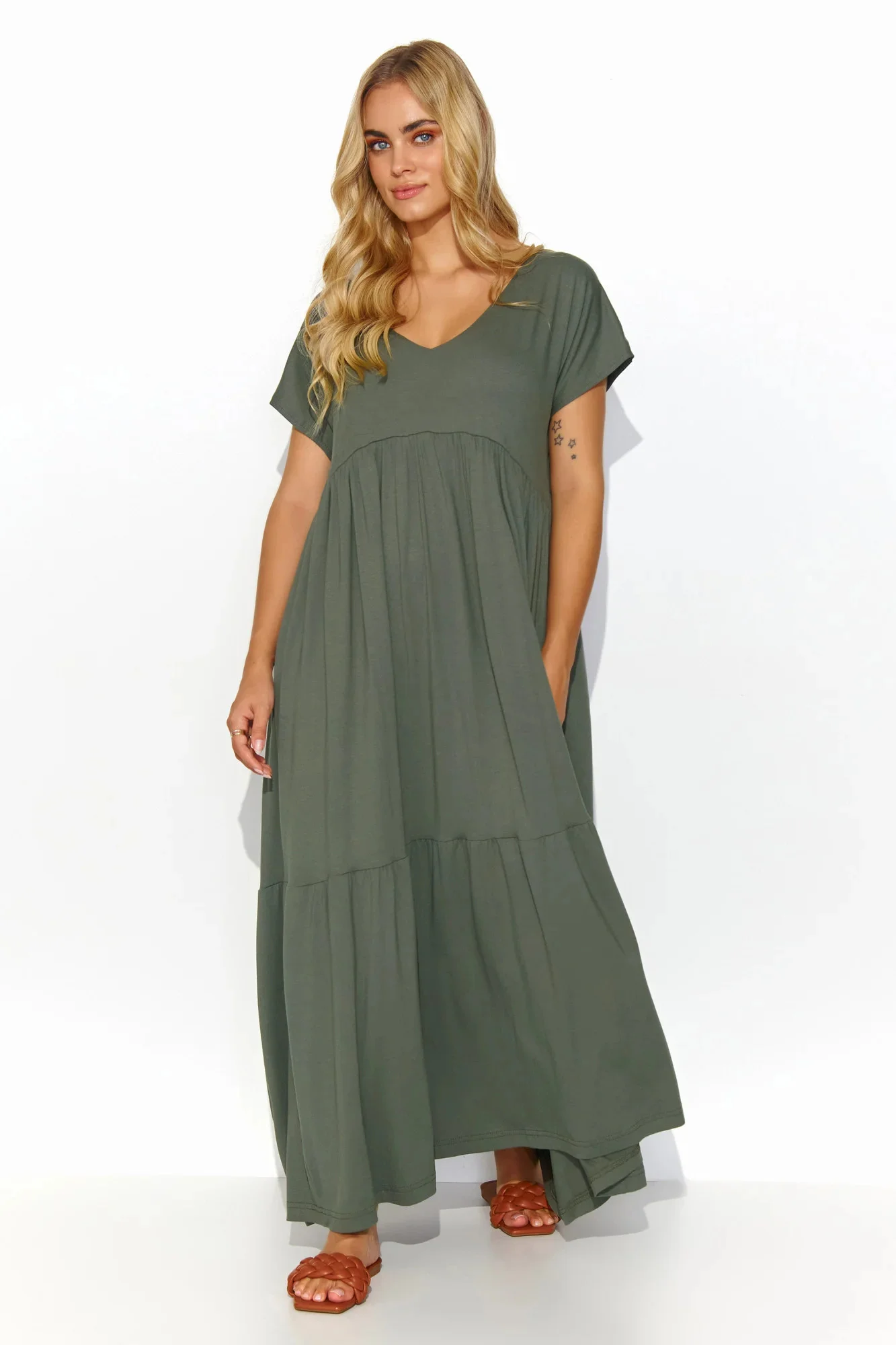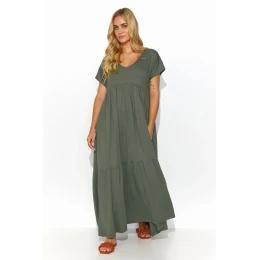 Viskózové šaty jsou vzdušné, ležérní a stále velmi módní. Naše maxi šaty volného střihu mají na dvou místech prošití, které vytváří nápadný záhyb. Výstřih do V krásně odhaluje poprsí a klíční kosti. Další zajímavostí je minimalistická pozlacená kovová destička všitá do zadní části šatů. Tento model je dokonalým návrhem na ležérní outfit, který lze doplnit sportovní obuví, sandály nebo kozačkami. Ženy, které ocení ležérní styl, pohodlí a nadčasovost, si tyto šaty jistě zamilují.
