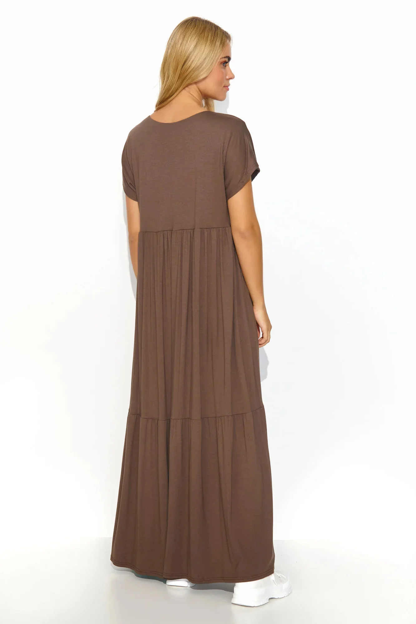 Viskózové šaty jsou vzdušné, ležérní a stále velmi módní. Naše maxi šaty volného střihu mají na dvou místech prošití, které vytváří nápadný záhyb. Výstřih do V krásně odhaluje poprsí a klíční kosti. Další zajímavostí je minimalistická pozlacená kovová destička všitá do zadní části šatů. Tento model je dokonalým návrhem na ležérní outfit, který lze doplnit sportovní obuví, sandály nebo kozačkami. Ženy, které ocení ležérní styl, pohodlí a nadčasovost, si tyto šaty jistě zamilují.