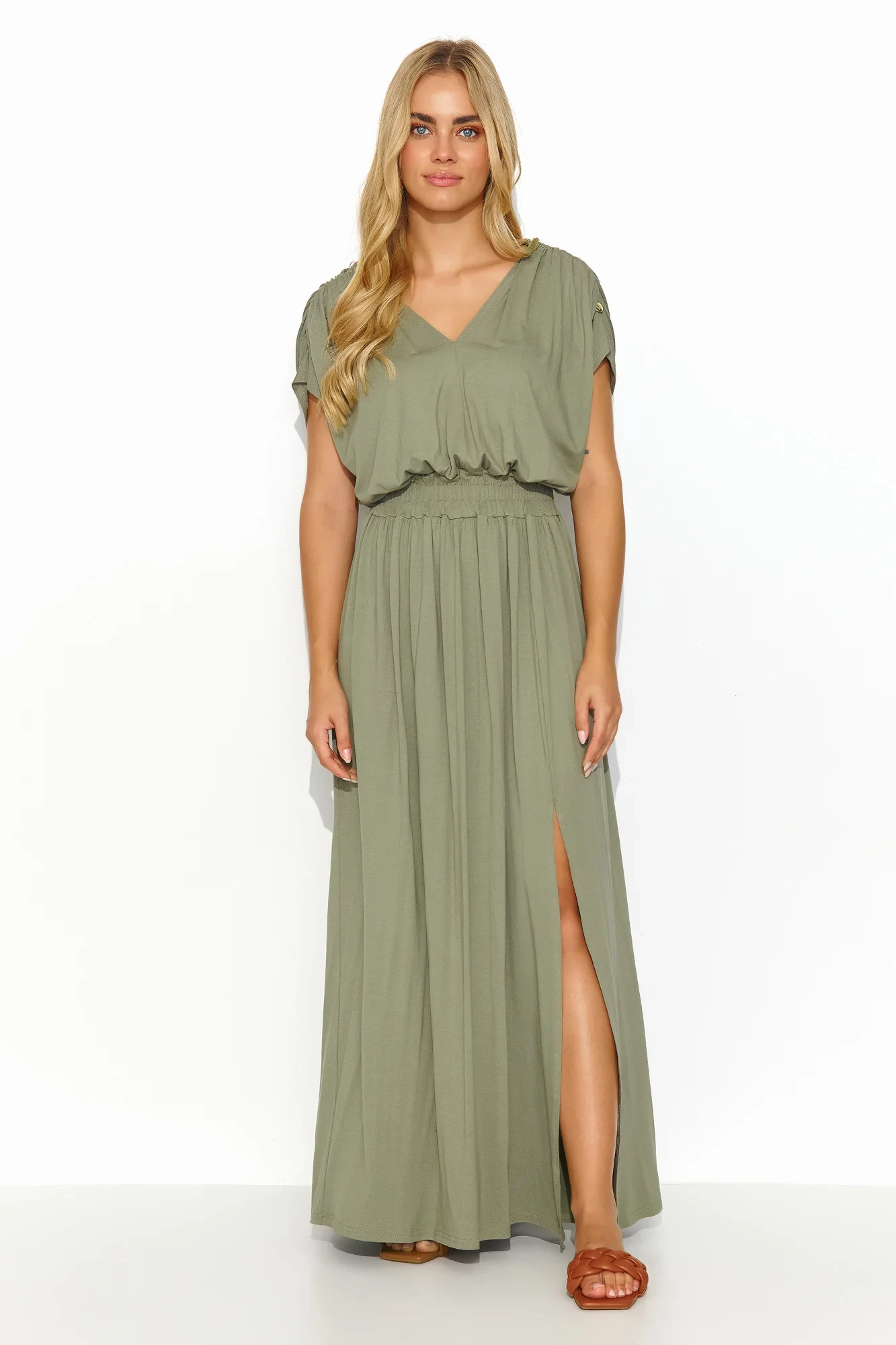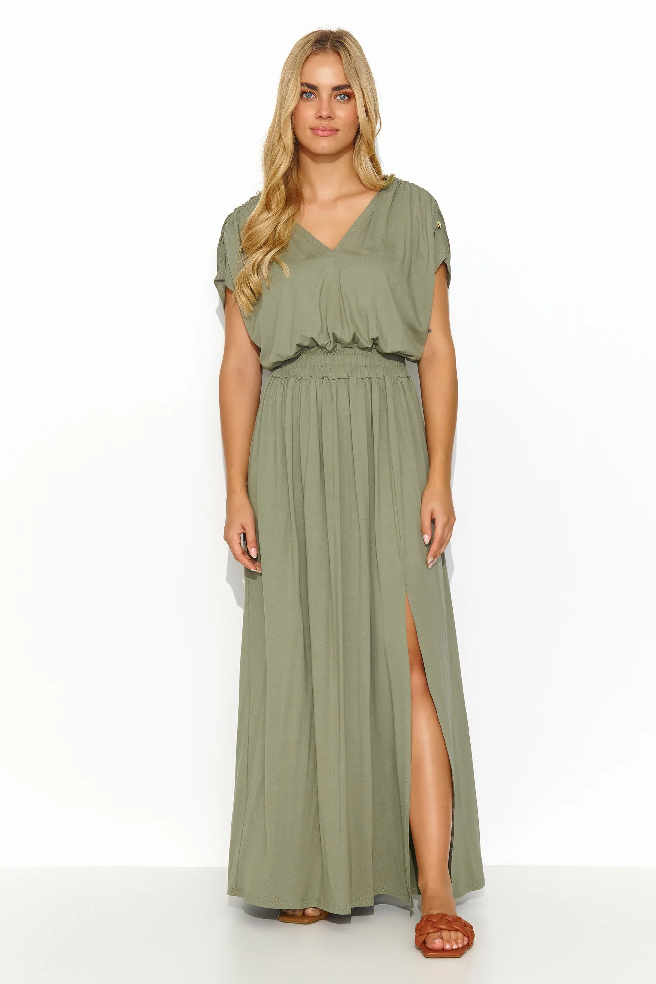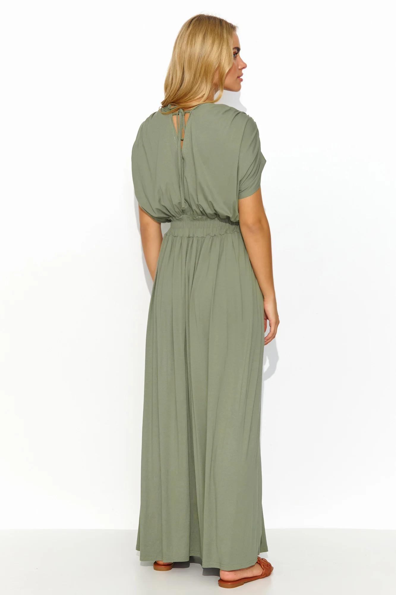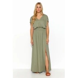 Dlouhé lehké úpletové šaty jsou ideální volbou pro letní dny a poskytují nejen volnost, ale také vyjádření osobního stylu. Srdíčkový výstřih a zavazování na zádech dodávají šatům jemnost a ženský půvab a zároveň zvýrazňují krk a záda. V pase je šňůrka, která jemně zvýrazňuje pas a dodává šatům lehkost a eleganci. Rozparky vpředu dodávají kreaci nádech extravagance, zvýrazňují ženskou siluetu a zároveň poskytují praktický prvek. Krátký šňůrkový rukáv zdobený zlatou destičkou dodává šatům nádech elegance a jedinečnosti. Šaty jsou k dispozici v různých barvách, například v šedé, olivové, zemitě hnědé, džínové, černé a béžové, což vám umožní vybrat si odstín podle vašich individuálních potřeb a nálady. Skvěle se hodí pro různé příležitosti, od každodenních procházek až po večery s přáteli. Veškeré stylistické kouzlo se skrývá v detailech.