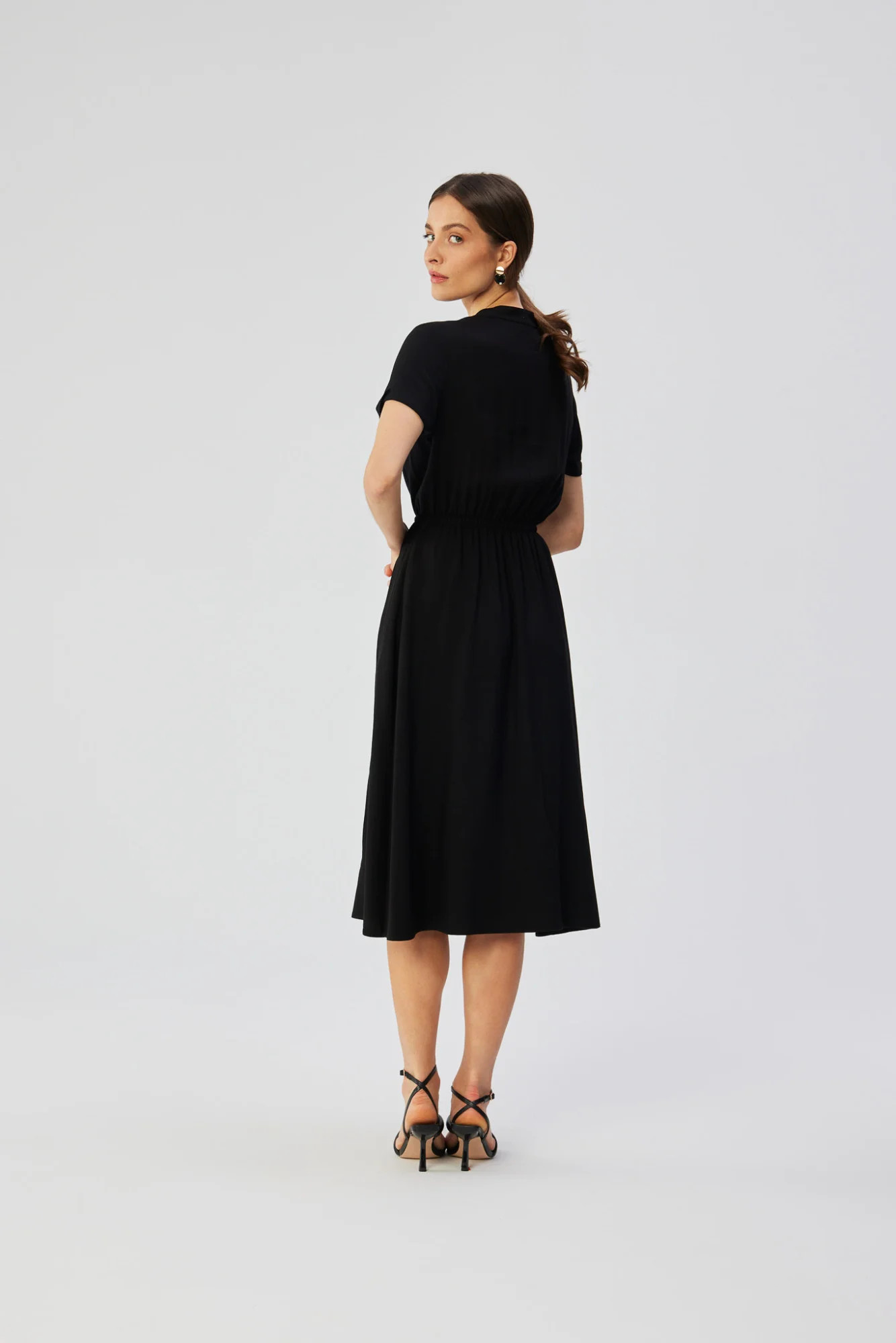 Tyto šaty z vysoce kvalitní viskózové tkaniny, vyrobené výhradně v Polsku, jsou kombinací elegance, pohodlí a místního řemeslného umění. Tkanina ze 100% viskózy zaručuje měkkost, jemnost a potěšení z nošení a zároveň vytváří mírně rozšířený střih šatů. V pase mají šaty stahovací šňůrku, která jemně zvýrazní ženské křivky a přizpůsobí je individuálním preferencím. Horní část šatů se rozepíná, což usnadňuje jejich oblékání a svlékání a dodává jim prvek praktičnosti. Pod krkem je stojáček, který šatům dodává sofistikovaný nádech. Krátké rukávy s mírným ohrnutím dodávají šatům lehký a svěží nádech a dokonale se hodí k letním stylům. Za zmínku stojí, že šaty nemají žádnou podšívku, díky čemuž látka dokonale přiléhá k tělu a zároveň zůstává lehká a vzdušná. Navrhování a šití v Polsku klade důraz na místní výrobu, což je další výhoda pro uvědomělé spotřebitele, kteří oceňují vysokou kvalitu a podporu místního řemesla.