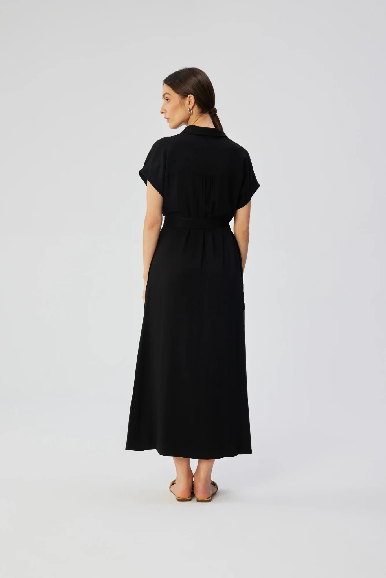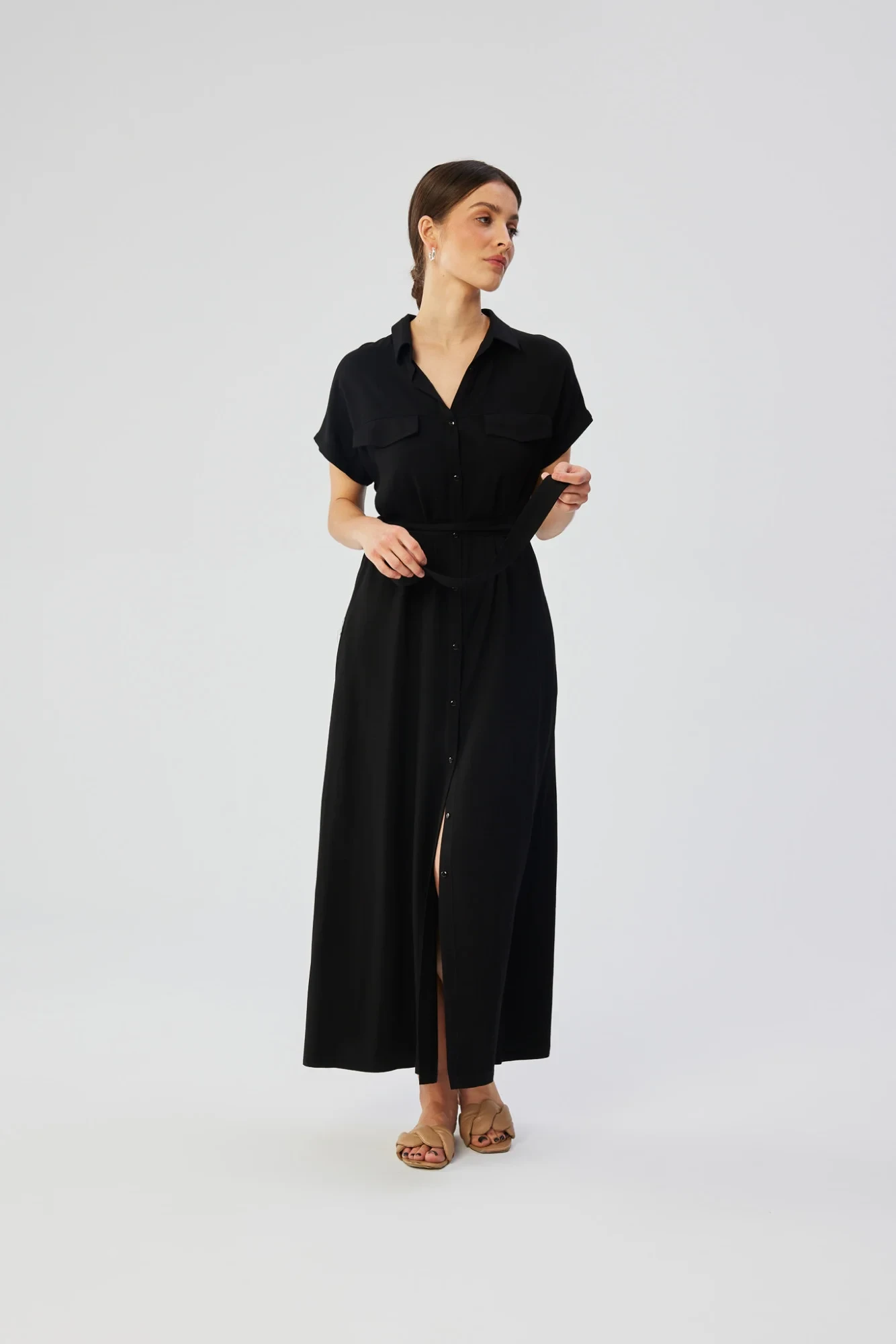 Tyto šaty na knoflíky, vytvořené z vysoce kvalitní 100% viskózy, jsou výjimečným kouskem oděvu, hrdě navrženým a ušitým v Polsku. Tyto maxi šaty vyzařují eleganci a pohodlí a vytvářejí harmonii mezi stylem a funkčností. Střih šatů s mírně rozšířeným průstřihem poskytuje volnost pohybu a zároveň je ideální pro různé příležitosti. Límec dodává šatům elegantní a šik nádech a celkovému vzhledu propůjčuje sofistikovaný nádech. Krátké kimonové rukávy dodávají stylingu lehkost a svěžest. Šaty se vpředu zapínají na knoflíky, což nejen usnadňuje jejich oblékání a svlékání, ale také jim dodává jemný retro nádech. Na úrovni prsou jsou ozdobné klopy, které šatům dodávají další půvab a originalitu. V pase je umístěn pásek na zavazování, který umožňuje přizpůsobit šaty individuálním preferencím a zároveň zdůraznit ženské křivky. Za zmínku stojí, že šaty nemají žádnou podšívku, díky čemuž viskózová tkanina dokonale přiléhá k tělu a zároveň zůstává příjemná k pokožce. Tyto šaty jsou nejen vyjádřením osobního stylu, ale také podporou domácí výroby a designu.
