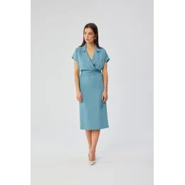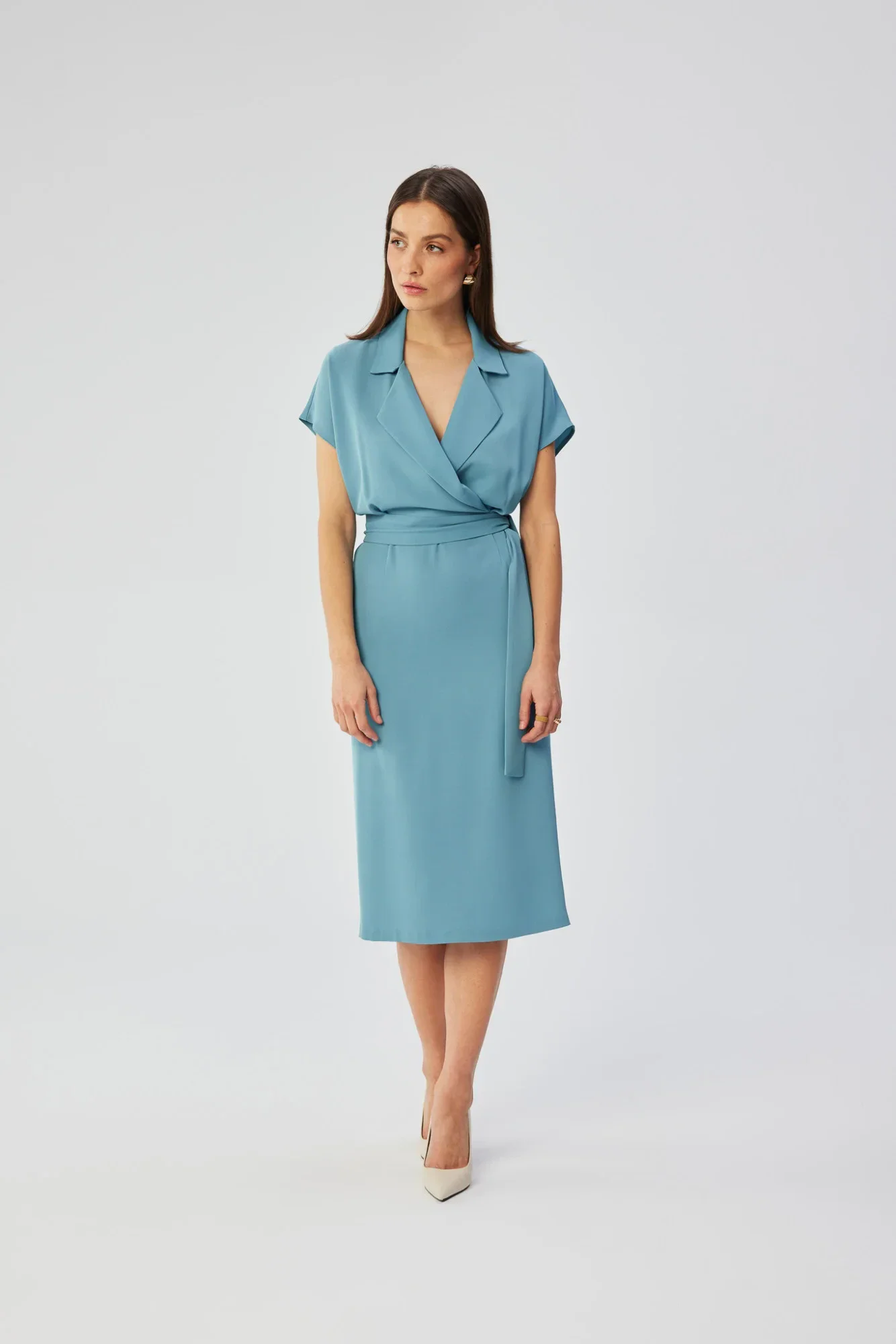 Šaty s jedinečným střihem a vynikajícím zpracováním, vytvořené z jemné tkaniny, v sobě spojují eleganci a funkčnost. Jejich obálkový vršek s límečkem dodává stylingu jemnost a zároveň zdůrazňuje ženský půvab. Krátké kimonové rukávy dodávají šatům lehkost a modernost. Rovný střih šatů, opatřený páskem na zavázání v pase, umožňuje přizpůsobení a zároveň jemně zvýrazňuje ženské křivky. Na zadní straně, v úrovni pasu, se nachází elastický pásek, který zajišťuje, že se šaty pohodlně nosí a dokonale se přizpůsobí postavě. Midi délka dodává šatům univerzálnost, takže se hodí jak na formální schůzky, tak i na neformálnější příležitosti. Díky absenci podšívky látka jemně leží na těle a zároveň zůstává lehká a vzdušná. Na zadní straně šatů byl umístěn rozparek, který celkovému vzhledu dodává jemný nádech a dále usnadňuje pohyb. Jedná se nejen o elegantní oděv, ale také o vyjádření podpory polskému designu, neboť šaty byly navrženy a ušity v Polsku, což podtrhuje jejich vysokou kvalitu a místní charakter.