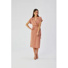 Šaty s jedinečným střihem a vynikajícím zpracováním, vytvořené z jemné tkaniny, v sobě spojují eleganci a funkčnost. Jejich obálkový vršek s límečkem dodává stylingu jemnost a zároveň zdůrazňuje ženský půvab. Krátké kimonové rukávy dodávají šatům lehkost a modernost. Rovný střih šatů, opatřený páskem na zavázání v pase, umožňuje přizpůsobení a zároveň jemně zvýrazňuje ženské křivky. Na zadní straně, v úrovni pasu, se nachází elastický pásek, který zajišťuje, že se šaty pohodlně nosí a dokonale se přizpůsobí postavě. Midi délka dodává šatům univerzálnost, takže se hodí jak na formální schůzky, tak i na neformálnější příležitosti. Díky absenci podšívky látka jemně leží na těle a zároveň zůstává lehká a vzdušná. Na zadní straně šatů byl umístěn rozparek, který celkovému vzhledu dodává jemný nádech a dále usnadňuje pohyb. Jedná se nejen o elegantní oděv, ale také o vyjádření podpory polskému designu, neboť šaty byly navrženy a ušity v Polsku, což podtrhuje jejich vysokou kvalitu a místní charakter.