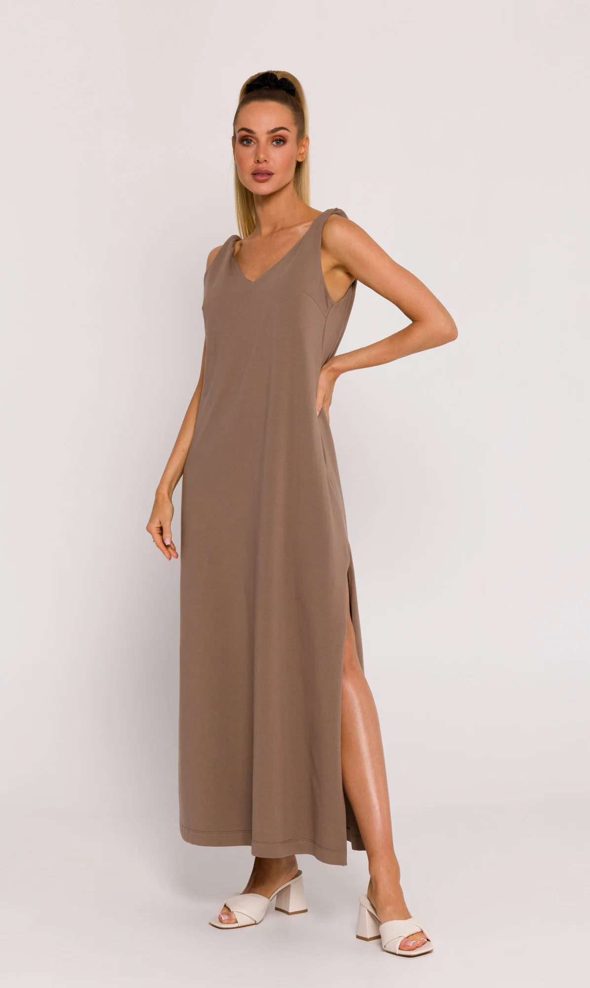 Pletené šaty jsou jedinečným produktem vytvořeným pro ženy, které si cení volnosti pohybu, pohodlí a módního stylu. Návrh a výroba probíhaly v Polsku, což zaručuje vysokou kvalitu zpracování a smysl pro detail. Šaty se prezentují oversize stylem, díky němuž se žena, která je nosí, cítí nejen pohodlně, ale také v souladu s aktuálními módními trendy. Střih do A dodává šatům volný, vzdušný charakter a zároveň zdůrazňuje jemnost a ženskost. Díky modelu šatů přes ramena je jejich nošení mimořádně pohodlné a zároveň zůstávají módním a stylovým kouskem šatníku. Kroucená ramínka dodávají šatům lehkost a zdůrazňují nonšalantnost a ležérnost. Výstřih šatů je vpředu řešen do tvaru písmene V, což jim dodává jemný a elegantní nádech. Nicméně právě hluboký výstřih s ozdobným třpytem umístěným na zádech dělá šaty tak nápadnými. Blinkr je pečlivě vyroben, dodává šatům jemný nádech a podtrhuje jejich design. Za zmínku stojí, že šaty nemají žádnou podšívku, takže jsou lehké a vzdušné. Jsou ideální volbou pro letní dny, kdy se chcete cítit pohodlně a zároveň stylově. Tyto pletené šaty nejsou jen kouskem šatníku, ale skutečným krejčovským dílem, které pochází z Polska, země s tradicí ve výrobě vysoce kvalitních oděvů.