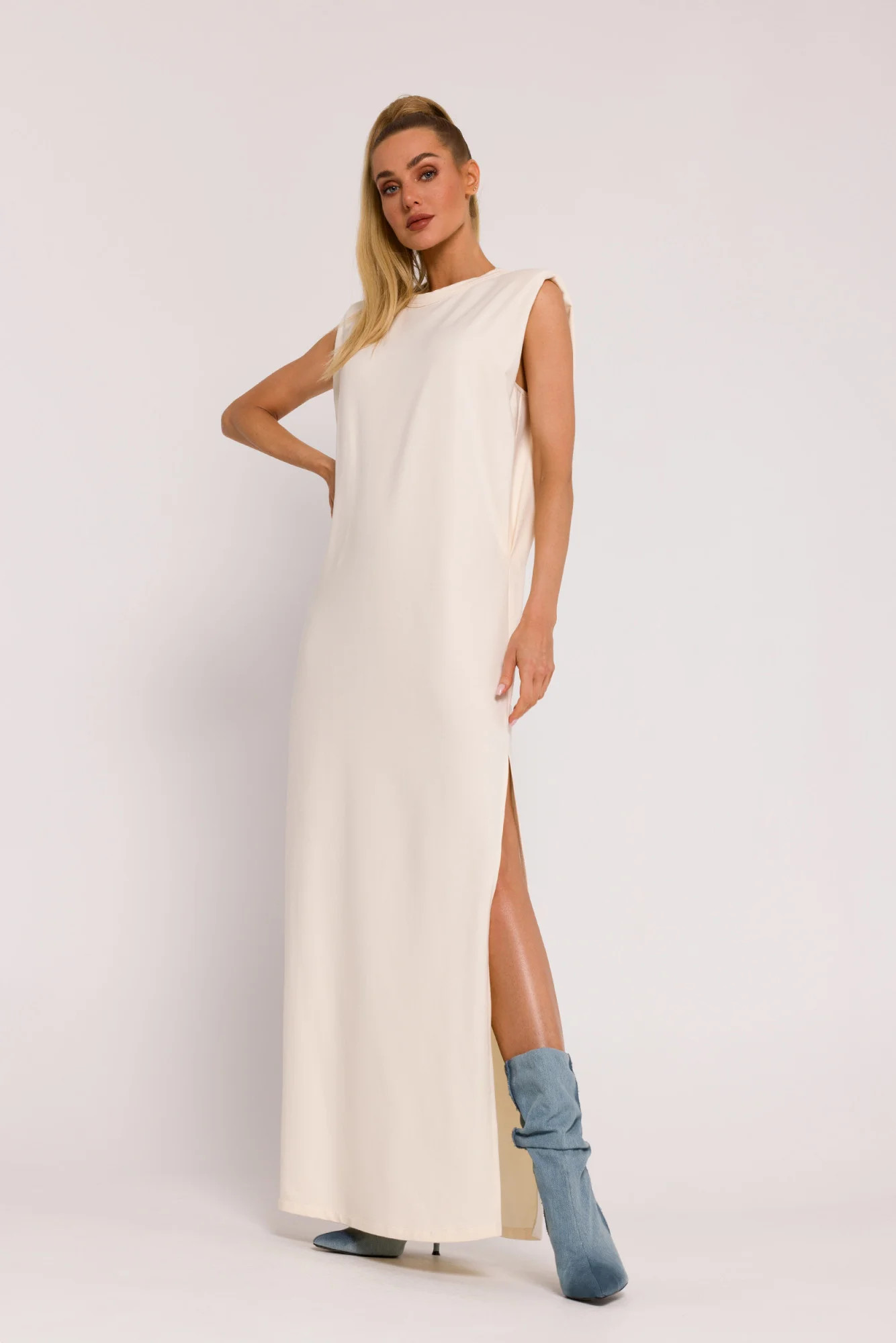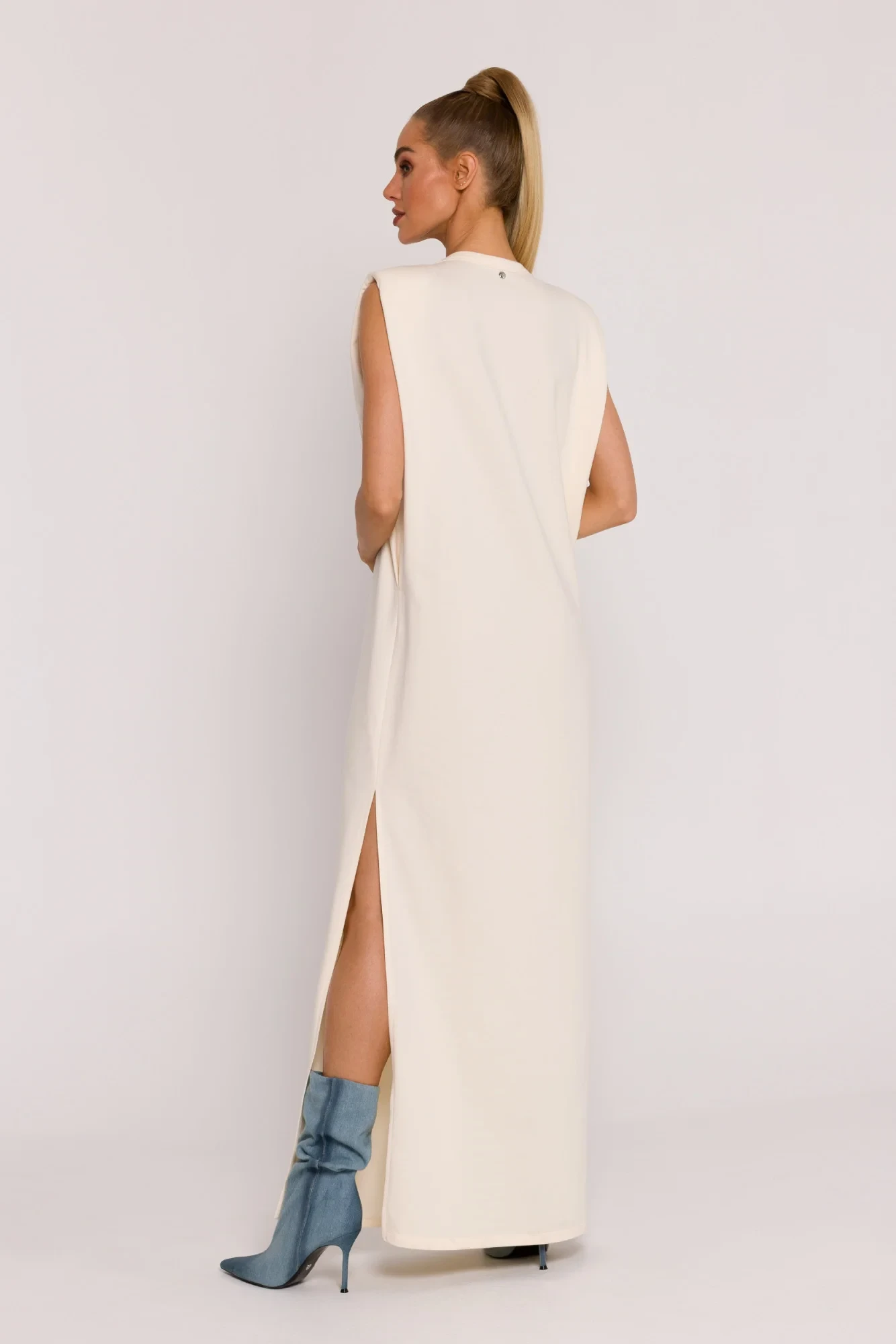 Tyto pletené šaty jsou výrazem luxusu a výjimečné polské krejčovské práce, kde se v jednom designu snoubí smysl pro detail a pohodlí. Jsou navrženy a ušity v Polsku a představují jedinečný styl a pohodlí při nošení. Šaty nadměrné velikosti jsou ideální volbou pro ženy, které si cení volnosti pohybu, aniž by obětovaly eleganci. Díky svému střihu, který se nosí přes hlavu, se mimořádně snadno a pohodlně nosí. Rozparky na bocích dodávají šatům lehkost a jemnou smyslnost. Provedení šatů bez rukávů, podpořené ramenními vycpávkami, dodává celému vzhledu moderní a jedinečný nádech. Ramenní vycpávky dodávají šatům strukturu a zároveň zdůrazňují jejich jedinečný tvar. Díky maxi délce se šaty hodí jak na elegantní vycházky, tak i na neformálnější příležitosti. Ozdobná etiketa na zádech je nejen designovým prvkem, ale také decentním akcentem, který celý design umocňuje. Pečlivé zpracování cínu podtrhuje vysokou kvalitu šatů. Díky absenci podšívky jsou navíc šaty vzdušné a lehké, což je ideální pro teplejší dny. Tyto pletené šaty nejsou pouhým oděvem, ale vyjádřením polské krejčovské tradice, která v sobě spojuje eleganci, pohodlí a jedinečný design. Ideální pro ženy, které se chtějí vyjádřit prostřednictvím módy a zdůraznit svůj individuální styl.