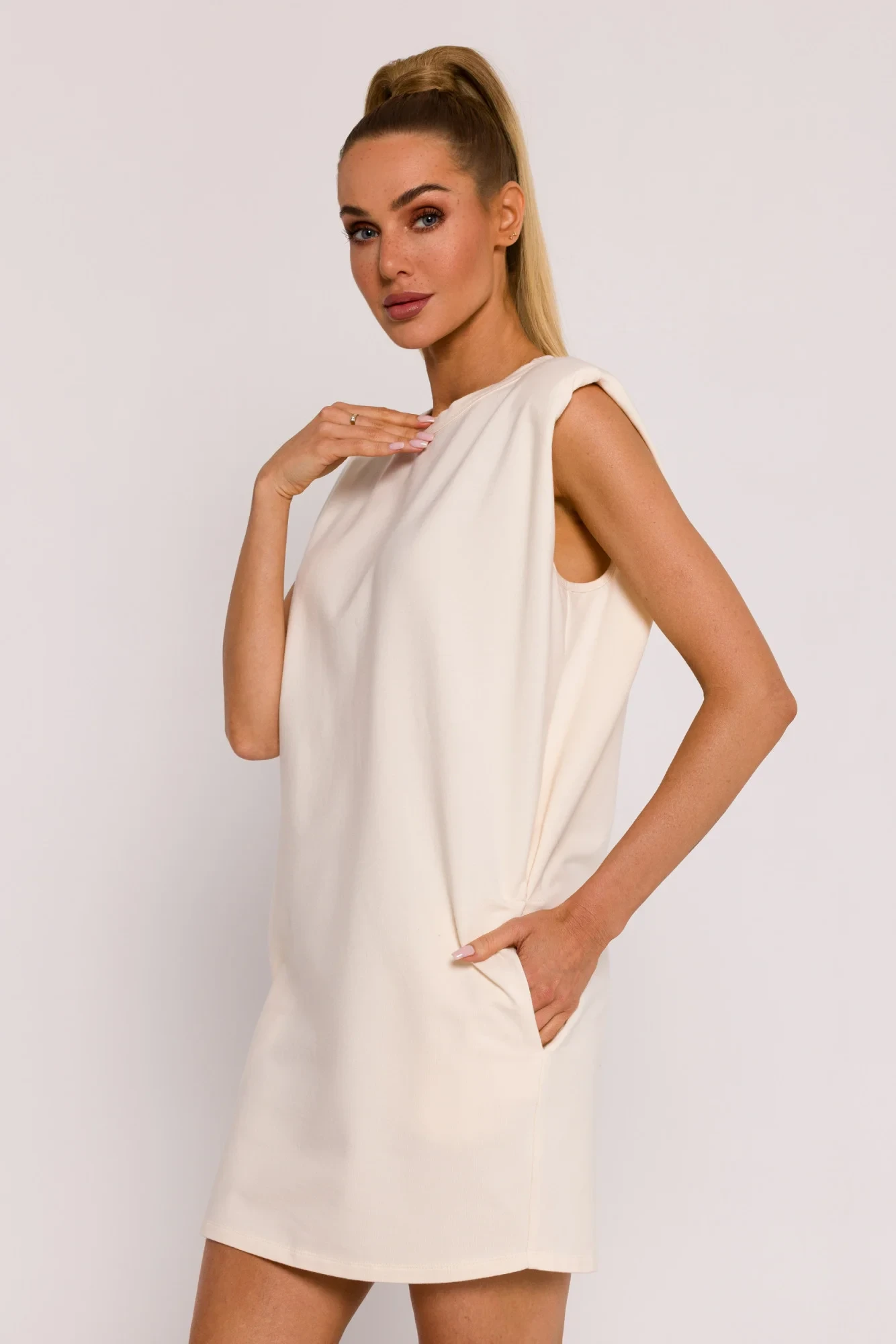 Tyto pletené šaty kombinují pohodlný oversize s polskou krejčovskou precizností a vytvářejí tak jedinečný produkt, ideální pro ženy, které ocení pohodlí i módní styl. Jsou navrženy a ušity v Polsku a představují jedinečný charakter a smysl pro detail. Díky střihu šatů, které se nosí přes hlavu, je jejich nošení mimořádně snadné a pohodlné. Bez rukávů, s přídavnými ramenními vycpávkami, jsou ideální pro letní dny, kterým dodávají jemný nádech modernosti a volnosti pohybu. Mini délka zdůrazňuje mladistvou energii a vytváří módní a originální vzhled. Boční kapsy skryté ve švech jsou praktickým prvkem, který šatům nejen dodává nonšalanci, ale také zvyšuje jejich funkčnost. Jsou ideální pro ženy, které v módě ocení praktické detaily. Ozdobná plaketa s vyraženým logem umístěná na zádech je jedinečným detailem, který podtrhuje vysokou kvalitu výrobku a obohacuje celý styling. Díky absenci podšívky jsou šaty lehké a vzdušné, ideální pro letní dny. Tyto pletené šaty jsou nejen kouskem šatníku, ale také výrazem polského krejčovského řemesla, které spojilo modernost, pohodlí a styl. Ideální pro ženy, které chtějí prostřednictvím módy vyjádřit svou individualitu.