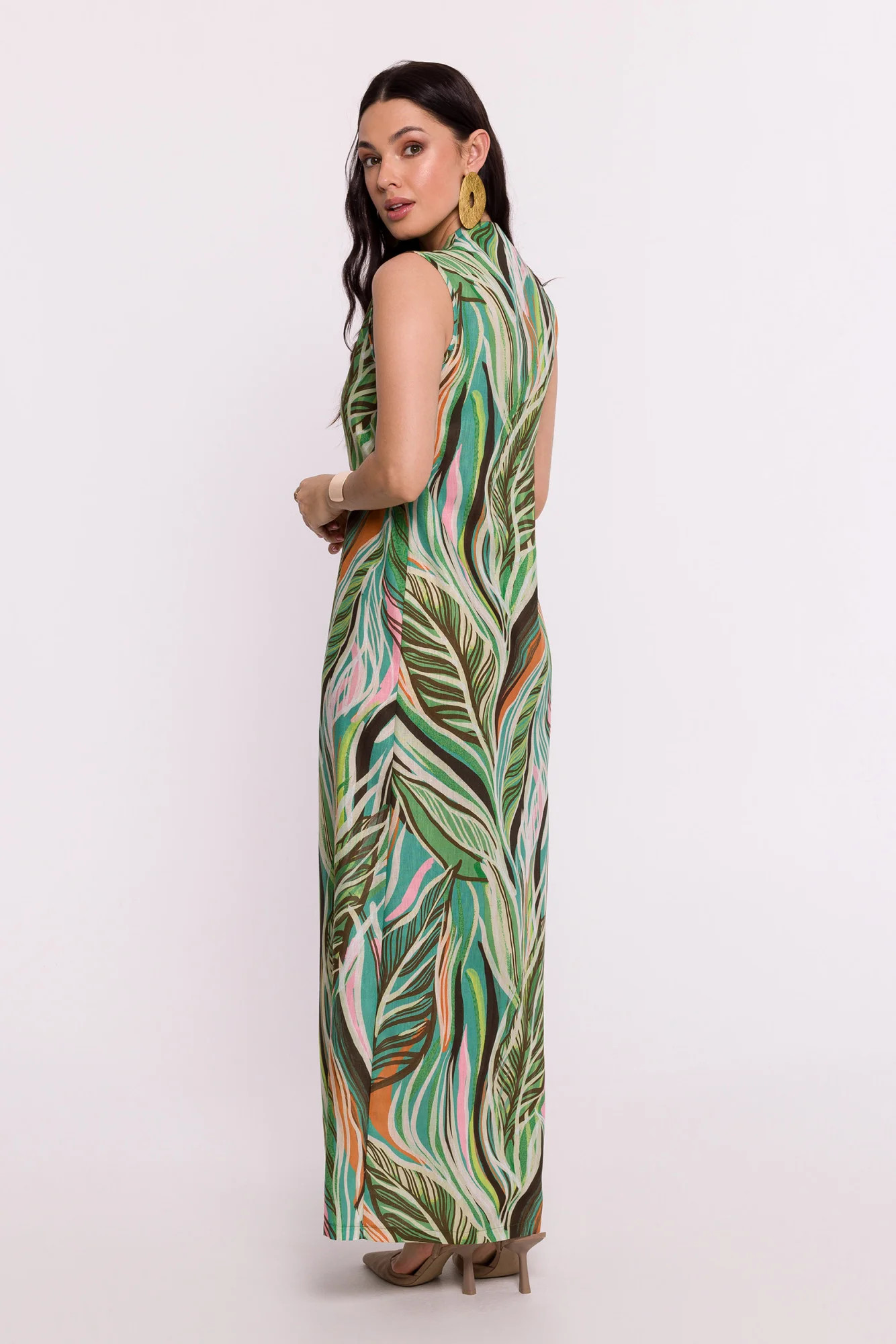 Šaty výjimečného designu z lehké tkaniny s originálním potiskem jsou skutečnou poctou polskému návrhářskému řemeslu. Tento model jsou maxi šaty, jejichž charakter podtrhuje smyslný výstřih ve tvaru písmene V. Pod výstřihem je navíc umístěno elegantní překrytí, které dodává kreaci jemnost a styl. Šaty jsou praktické a rychle se oblékají, protože se nosí přes hlavu, takže jejich nošení je velmi pohodlné. Střih bez rukávů dodává šatům lehkost a působí vzdušným letním dojmem. Absence podšívky zase podtrhuje lehkost materiálu a umožňuje pokožce volně dýchat. Na boku šatů je umístěn decentní rozparek, který dodává kreaci rafinovaný pohyb a zdůrazňuje ženskou siluetu. Látka s originálním potiskem je jedinečným prvkem, který dodává šatům osobní nádech a činí je jedinečnými. Návrh a výroba šatů probíhá v Polsku, což dokazuje závazek vůči módnímu průmyslu této země. Tyto šaty jsou nejen vyjádřením individuálního stylu, ale také hrdosti na polské dědictví tvořivosti a řemeslné zručnosti.