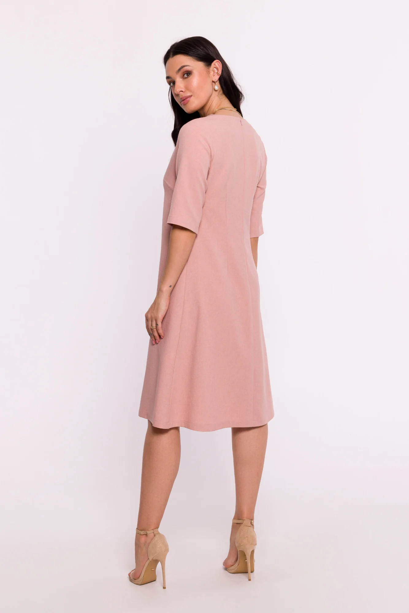 Látkové šaty jsou výjimečným příkladem polského designu, který v sobě spojuje jednoduchost tvaru, funkčnost a eleganci. Tento model, udržovaný ve tvaru lichoběžníku, vypadá mimořádně stylově a je ideální volbou pro mnoho příležitostí. Šaty se pohodlně nosí, protože se nasazují přes hlavu, takže se rychle a pohodlně oblékají. Krátké rukávy dodávají šatům lehkost a působí univerzálně, což je ideální pro teplejší dny. Na zádech je krytý zip, který šatům dodává eleganci a usnadňuje jejich oblékání. Kapsy umístěné v bočních švech jsou praktickým prvkem, který šatům dodává nonšalanci a činí je ještě funkčnějšími. Díky absenci podšívky jsou šaty lehké a příjemné na kůži, ideální pro letní dny. Návrh a výroba šatů probíhá v Polsku, což podtrhuje místní charakter a důraz na kvalitu zpracování. Tyto šaty jsou nejen výrazem elegance, ale také hrdosti na polské řemeslo a design, spojující jednoduchost tvarů s vysokým standardem pohodlí.