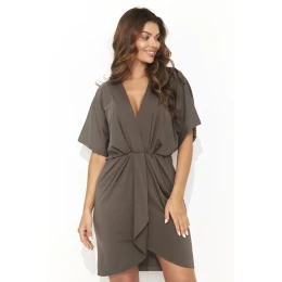 Krásné krátké kimonové šaty s jemnou šňůrkou v pase vyzařují eleganci a šik. Zlatá třpytivá destička na zádech dodává jemný dekorativní nádech. Hluboký výstřih zvýrazňuje poprsí a dodává šatům smyslný nádech. Tyto ženské šaty se skvěle hodí jak do práce, kde jim dodají elegantní šarm, tak na elegantní večeři, kde vytvoří nezapomenutelný vzhled. Jsou k dispozici v několika barvách, takže si můžete vybrat odstín, který nejlépe odráží individuální styl ženy, která je nosí. Jedná se o kombinaci klasiky a moderny, která jistě upoutá pozornost.