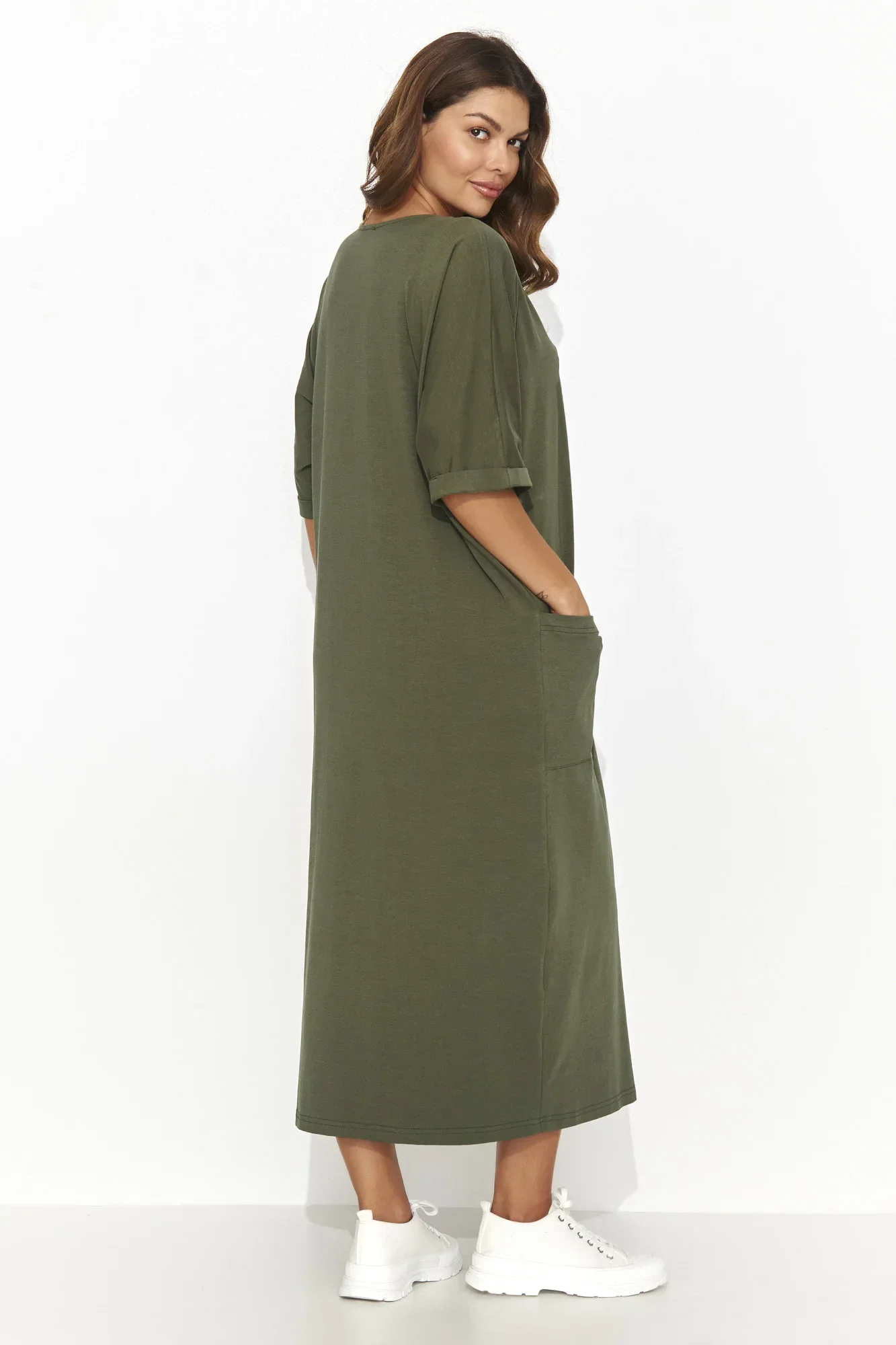 Dlouhé ležérní šaty s krátkými rukávy a výstřihem do V dokonale kombinují pohodlí s klasickou každodenní elegancí. Šaty mají na přední straně dvě praktické kapsy a na jedné z nich je navíc akcent v podobě zlatého pozlátka, které jim dodává jemný lesk. Jednoduché a elegantní šaty jsou dokonalou každodenní volbou pro pohodlí a nadčasový styl. Jsou k dispozici v několika barvách, což umožňuje přizpůsobit odstín vašim osobním preferencím. Vytvořte si s nimi univerzální vzhled pro různé příležitosti. Je to oděv, který podtrhne vaši osobnost a dodá vám sebevědomí. Perfektní kombinace s plochými sandály nebo espadrilkami.