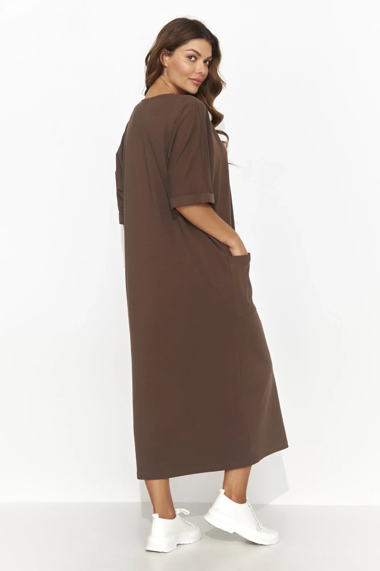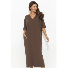 Dlouhé ležérní šaty s krátkými rukávy a výstřihem do V dokonale kombinují pohodlí s klasickou každodenní elegancí. Šaty mají na přední straně dvě praktické kapsy a na jedné z nich je navíc akcent v podobě zlatého pozlátka, které jim dodává jemný lesk. Jednoduché a elegantní šaty jsou dokonalou každodenní volbou pro pohodlí a nadčasový styl. Jsou k dispozici v několika barvách, což umožňuje přizpůsobit odstín vašim osobním preferencím. Vytvořte si s nimi univerzální vzhled pro různé příležitosti. Je to oděv, který podtrhne vaši osobnost a dodá vám sebevědomí. Perfektní kombinace s plochými sandály nebo espadrilkami.