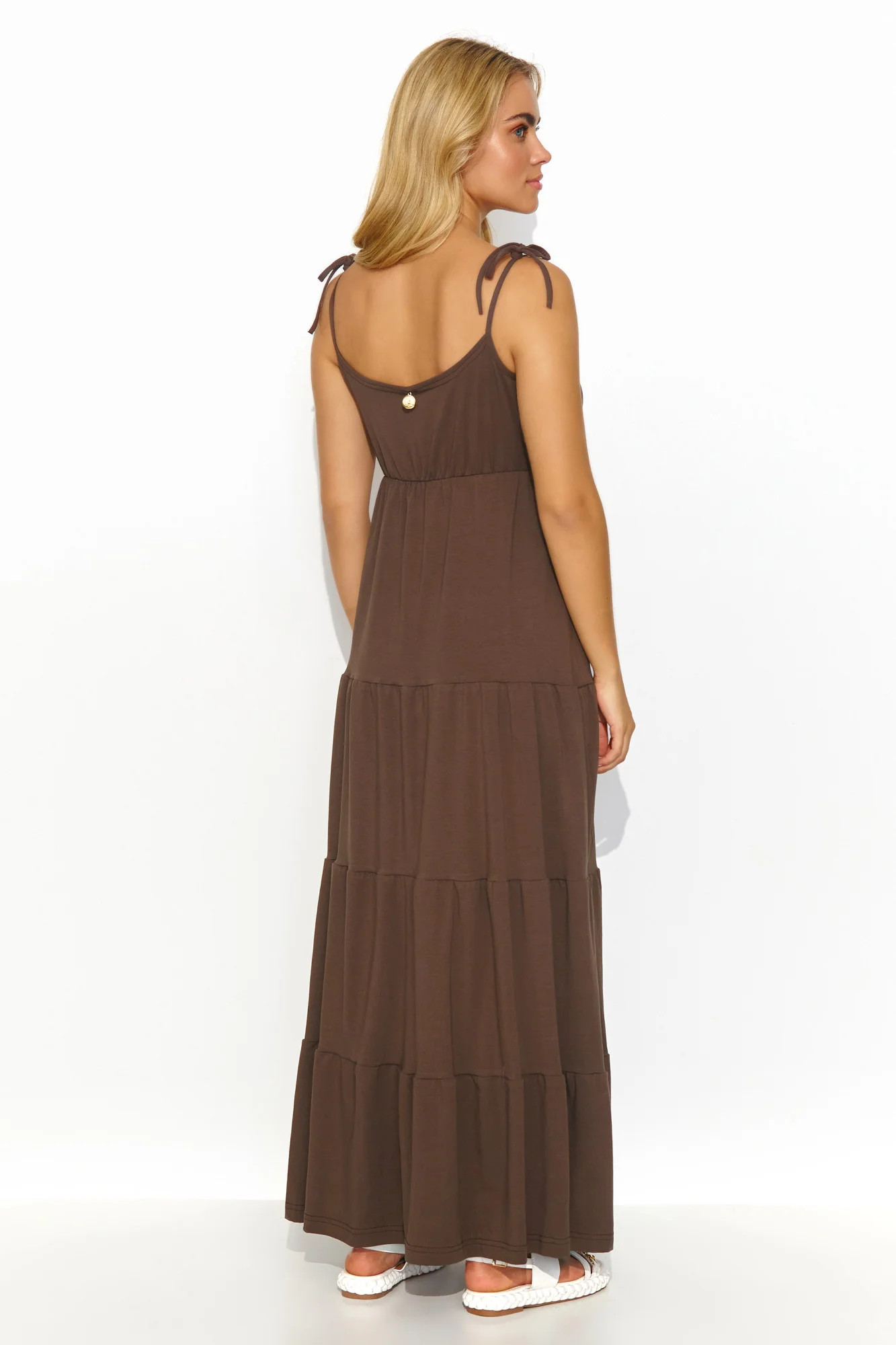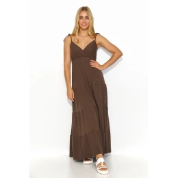 Tyto dlouhé letní šaty, rozdělené na segmenty, které imitují jemné volánky, jsou kvintesencí lehkosti a romantiky. Šaty se zavazují na tenké šňůrky, které jim dodávají jedinečnou jemnost a volnost pohybu. Překrývající se výstřih do V jemně zvýrazňuje poprsí a dodává kreaci ženský půvab. Ozdobná zlatá destička všitá do zadního dílu dodává šatům eleganci a jedinečný půvab. Letní kreace se dodává v různých barvách, které vyhovují individuálním preferencím a stylu.