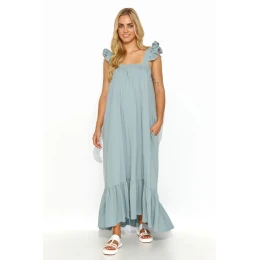 Maxi šaty s volánky na ramínkách a ve spodní části jsou kvintesencí letního stylu a ležérnosti. Díky praktickým postranním nakládaným kapsám vypadají šaty nejen stylově, ale jsou také funkční. Díky volnému střihu jsou mimořádně pohodlné a vhodné pro nejrůznější příležitosti. Lze je nosit volně, a zvolit tak lehkost a ležérnost, nebo je sepnout páskem, který zvýrazní pas a dodá kreaci výraznější tvar. Je k dispozici v různých barvách, takže vám umožní přizpůsobit se vašemu stylu a náladě. Tyto šaty jsou ideální na procházku po molu nebo na romantickou večeři při západu slunce, budete v nich vypadat nejen stylově, ale budou také pohodlné a lehké na nošení, takže si budete moci naplno užívat letních chvil.