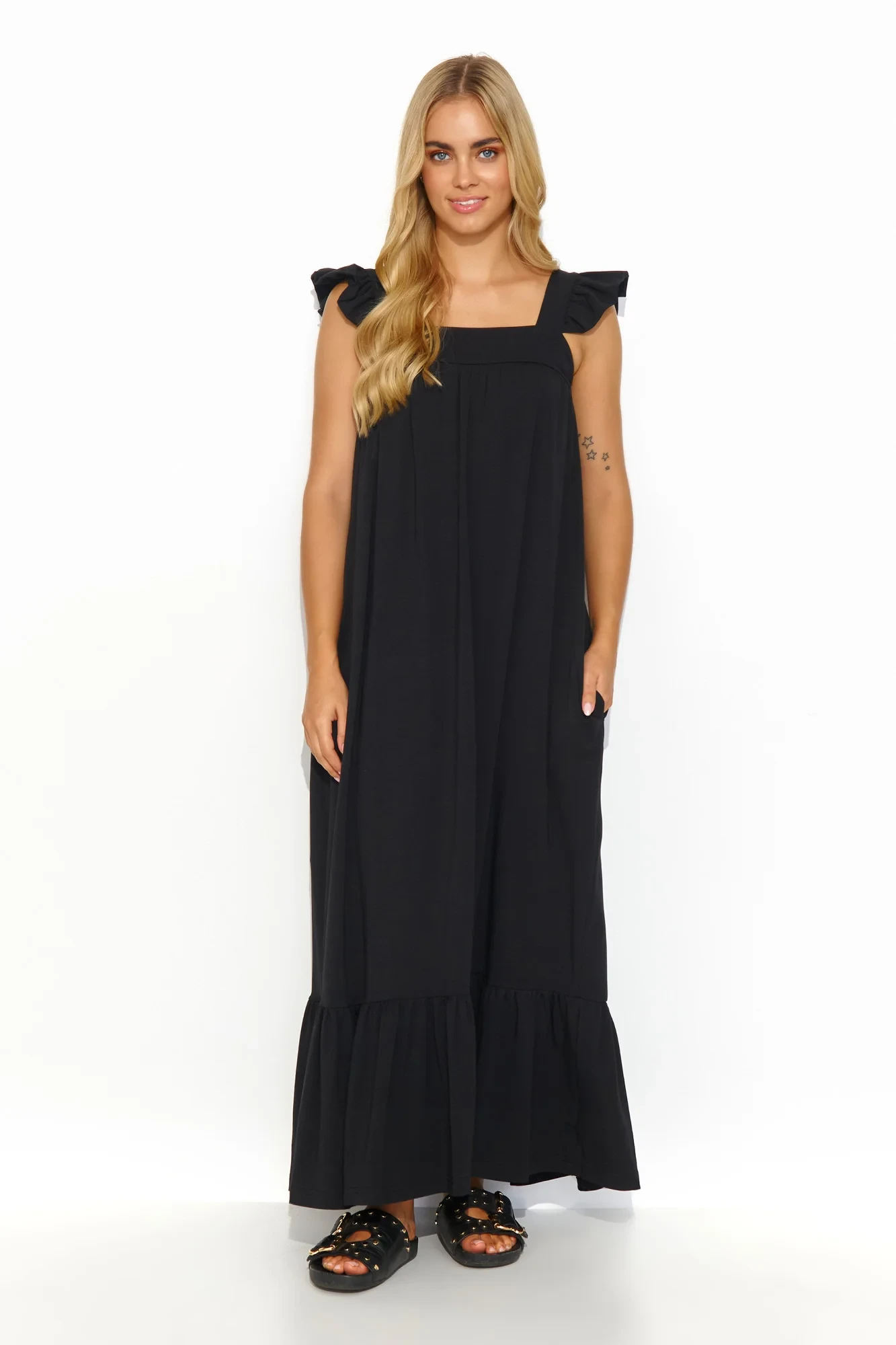 Maxi šaty s volánky na ramínkách a ve spodní části jsou kvintesencí letního stylu a ležérnosti. Díky praktickým postranním nakládaným kapsám vypadají šaty nejen stylově, ale jsou také funkční. Díky volnému střihu jsou mimořádně pohodlné a vhodné pro nejrůznější příležitosti. Lze je nosit volně, a zvolit tak lehkost a ležérnost, nebo je sepnout páskem, který zvýrazní pas a dodá kreaci výraznější tvar. Je k dispozici v různých barvách, takže vám umožní přizpůsobit se vašemu stylu a náladě. Tyto šaty jsou ideální na procházku po molu nebo na romantickou večeři při západu slunce, budete v nich vypadat nejen stylově, ale budou také pohodlné a lehké na nošení, takže si budete moci naplno užívat letních chvil.