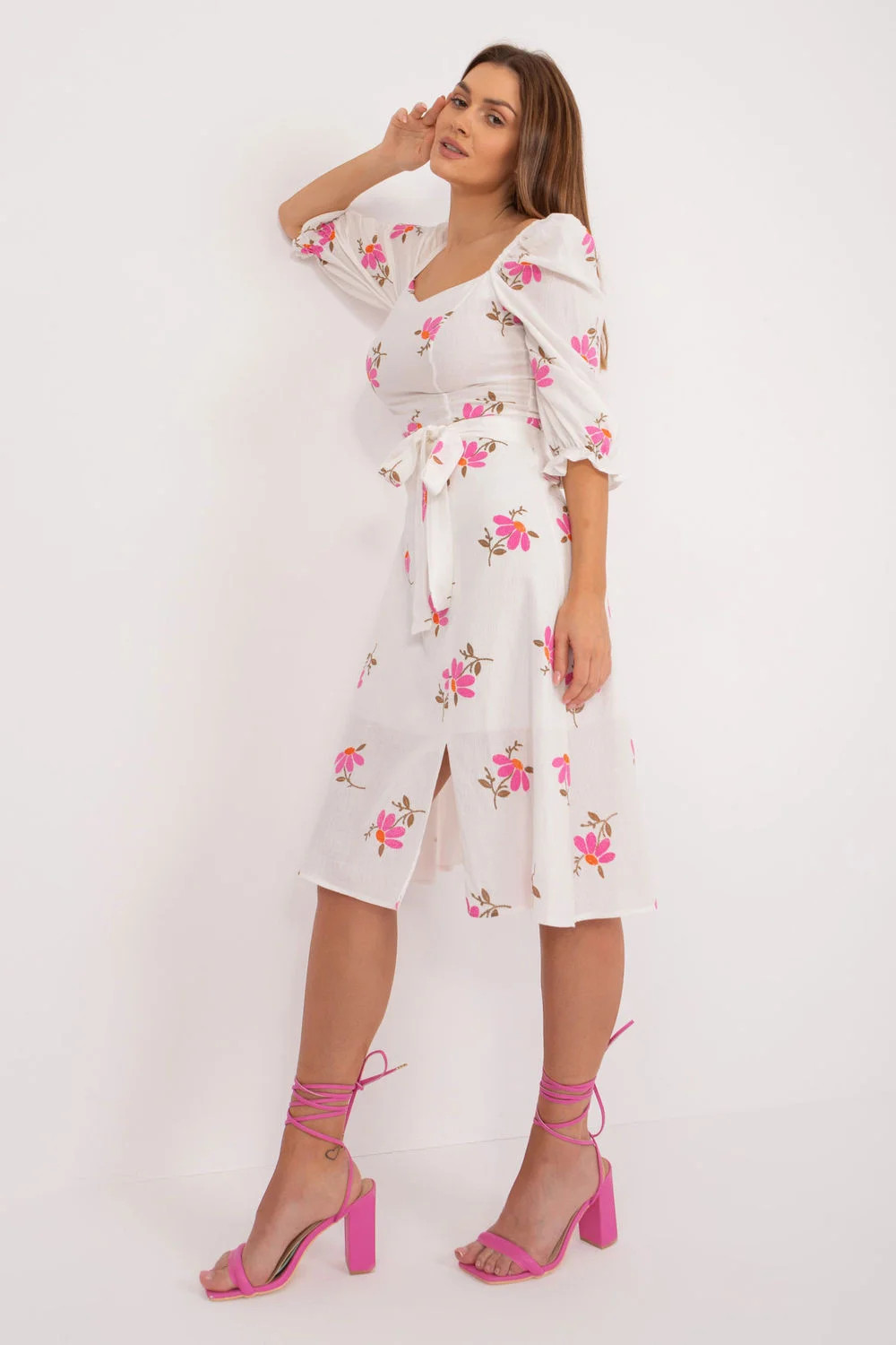 Tyto letní šaty jsou ideální volbou pro každodenní nošení a vyzařují svěžest a lehkost. Díky rozšířenému střihu jsou nejen pohodlné, ale také velmi ženské. Šaty jsou vyrobeny z lehké tkaniny s potiskem květin a mají midi délku, takže se hodí pro různé příležitosti od procházek po pláži až po letní pozdní snídaně. Krátké rukávy a obdélníkový výstřih dodávají šatům půvab a lehkost a zároveň umožňují volnost pohybu. Díky krytému zapínání na zip se šaty snadno oblékají i svlékají. Zavazovací pásek navíc zvýrazňuje pas a dodává siluetě ženský tvar. Volánový rukáv dodává šatům romantický půvab a podtrhuje letní atmosféru. Mimořádně praktickým doplňkem je také podšívka, která poskytuje pohodlí a další ochrannou vrstvu. V těchto šatech se budete cítit žensky i ležérně a budete připravena na každodenní letní dobrodružství.