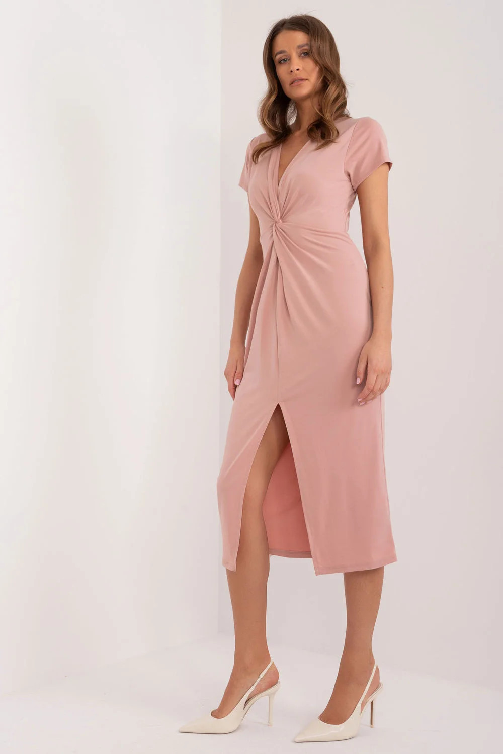 Tyto šaty jsou kombinací elegance a pohodlí, ideální pro každodenní nošení. Jsou vyrobeny z hladké tkaniny, která jemně sedí na těle, a působí stylově a moderně. Jejich přední díl zdobí nápadné řasení, které jim dodává jemnost a ženský půvab a zároveň zakrývá případné nedokonalosti. Krátké rukávy a výstřih do V zdůrazňují jemnou siluetu a dodávají šatům eleganci a jemnost. Midi délka jim dodává univerzální charakter, díky němuž se hodí pro různé příležitosti. Tužkové šaty jsou klasikou, která vždy vypadá stylově a elegantně. Jejich vypasovaný střih zvýrazňuje ženské křivky a dodává jim sebejistotu a šik. Rozparky ve spodní části šatů navíc dodávají šatům lehkost a dynamiku. Šaty jsou vyrobeny převážně z polyesteru, takže se snadno udržují a ošetřují, přičemž si zachovávají skvělý vzhled po dlouhou dobu. Díky této kombinaci stylu, pohodlí a funkčnosti se tyto šaty stanou nezbytným kouskem šatníku, díky kterému bude každý den plný sebevědomí a elegance.