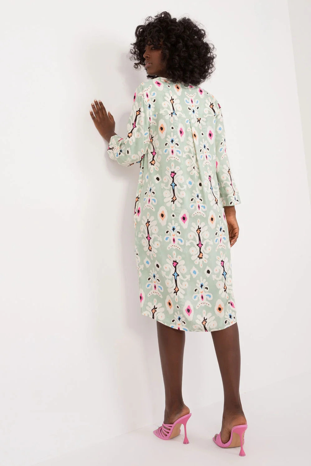 Tato každodenní šaty spojují pohodlí s módním vzhledem, což je činí ideální volbou pro různé příležitosti. Jsou vyrobeny z měkké a prodyšné viskózy, jsou příjemné na dotek a prodyšné, což zajišťuje jejich použití jak v teplých dnech, tak v chladných večerech. Šaty mají oversize střih, který poskytuje volnost pohybu a dodává jim volný, neformální charakter. Dlouhý rukáv přidává eleganci a výstřih ve tvaru srdce s ozdobným záhybem vytváří jemný, ženský akcent. Pestrobarevný potisk dodává šatům výraznost a styl, ideální na každodenní výlety. Praktické vložené kapsy po stranách jsou další výhodou, umožňující pohodlné uložení vědrostí. Šaty nemají zapínání, což zvyšuje pohodlí nošení a usnadňuje oblékání. Délka nad koleno dodává lehkost a mladistvou krásu. Tyto šaty jsou skvělou volbou pro ženy, které ocení módní vzhled spojený s pohodlím v každodenním životě.