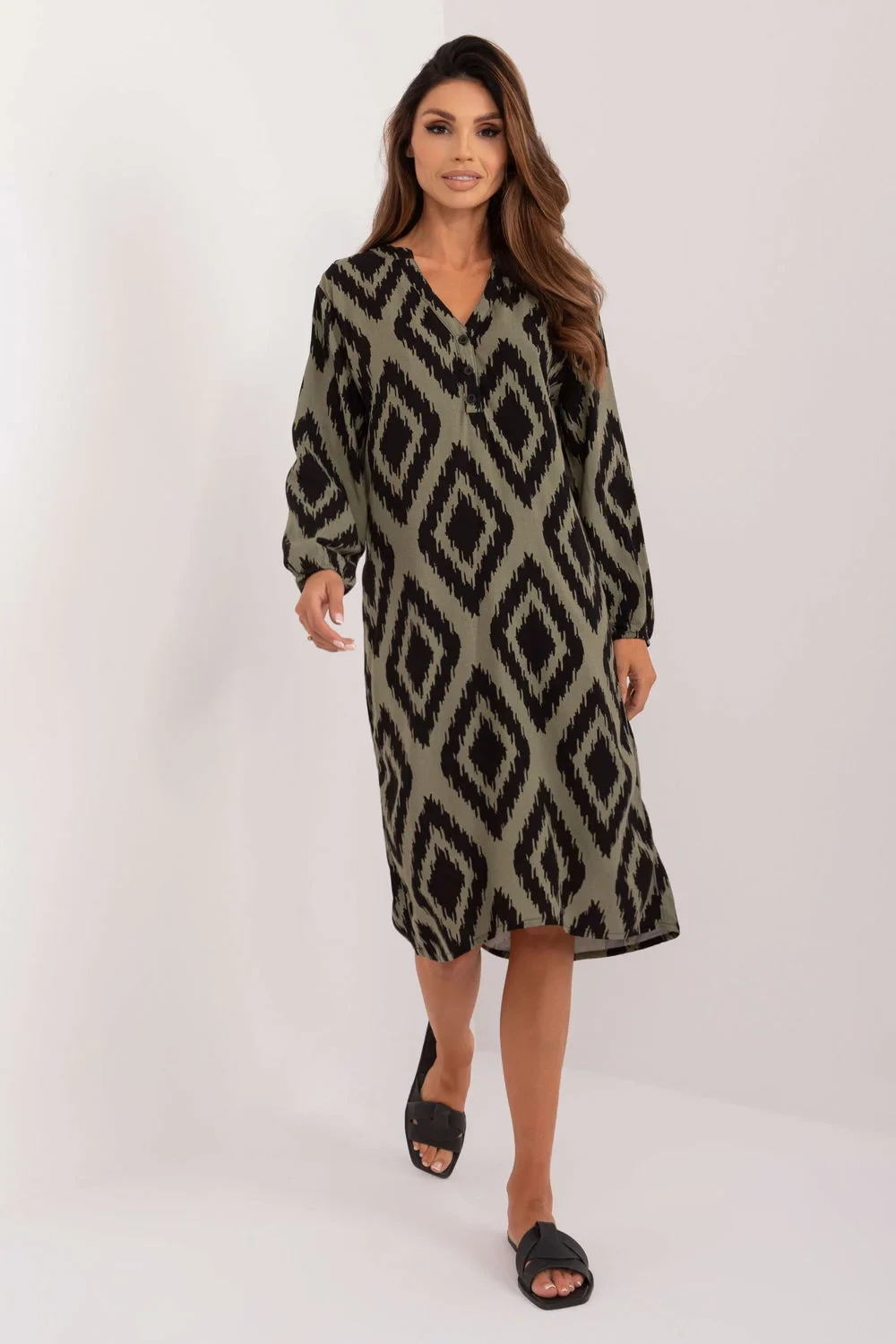 Tyto letní šaty jsou ideální volbou pro každý den a spojují v sobě pohodlí, styl a ekologickou ohleduplnost. Díky výraznému košilovému střihu jsou nejen módní, ale také praktické a všestranné. Šaty jsou vyrobeny z měkké a vzdušné viskózy, jsou ideální pro teplé dny a poskytují pohodlí a volnost pohybu. Jeho dlouhý rukáv mu dodává všestrannost, takže ho lze nosit nejen v létě, ale i v chladnějších dnech. Šaty mají délku sahající před kolena, což jim dodává dívčí a ležérní vzhled. Asymetrický střih dodává šatům originalitu a modernost a podtrhuje individuální styl nositelky. Potisk dodává šatům lehkost a svěžest a dokonale se snoubí s letním počasím. Srdíčkový výstřih jemně odhaluje klíční kosti a dodává celému stylingu ženskost a jemnost. Ozdobou jsou knoflíky ve výstřihu, které šatům dodávají elegantní nádech. Jako ekologický oděv tyto šaty nejen skvěle vypadají, ale také podporují myšlenku udržitelné módy, takže jejich nošení je navíc zábavné a přínosné. Budou ideální jako každodenní volba pro ženy, které si cení pohodlí, stylu a péče o životní prostředí.