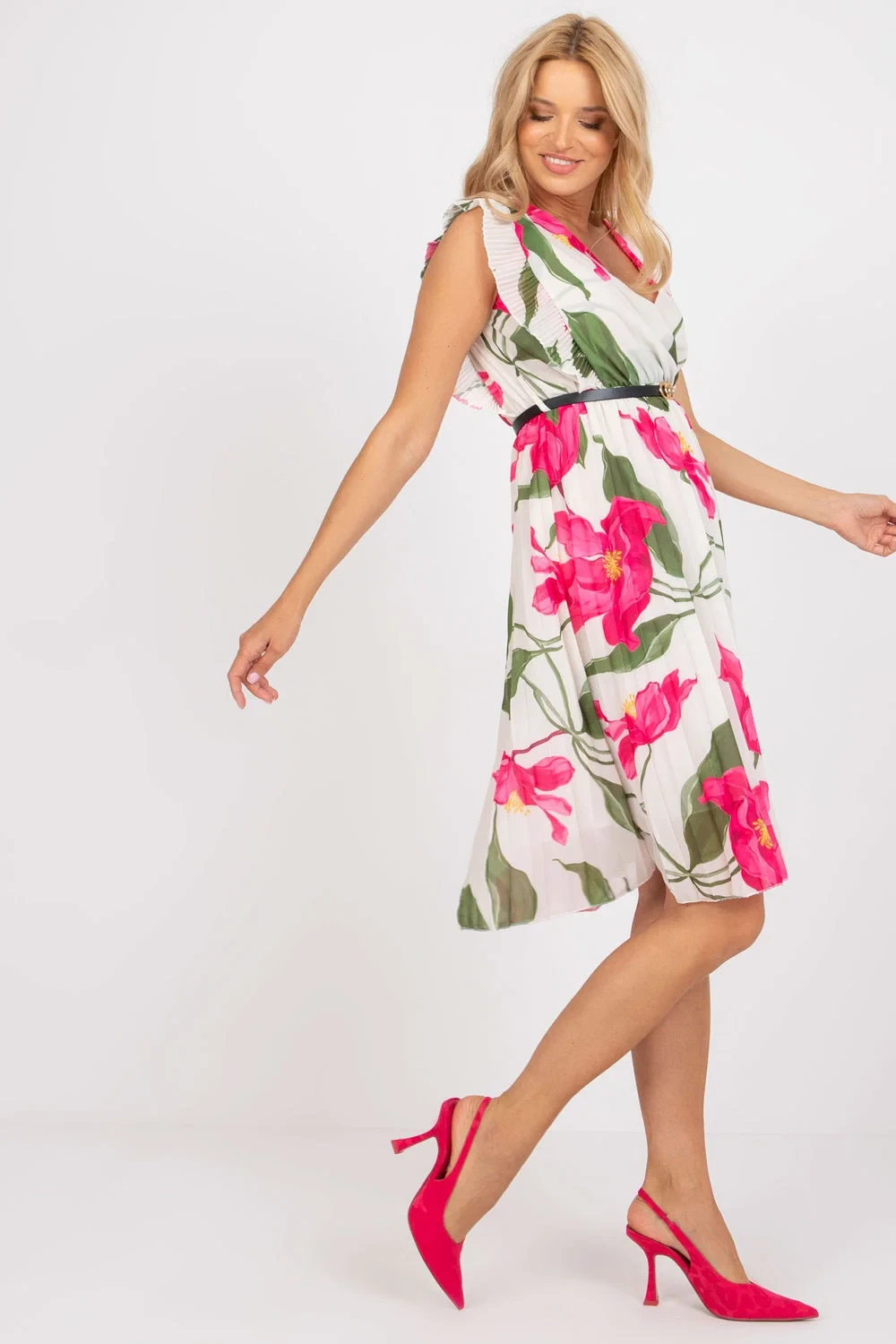 Plisované letní šaty s krátkými rukávy s volánkovým vzorem pro mnoho příležitostí. Šaty mají podšívku, pružný pas a srdíčkový výstřih. Kromě volánů jsou šaty s rozšířeným střihem doplněny páskem v pase.