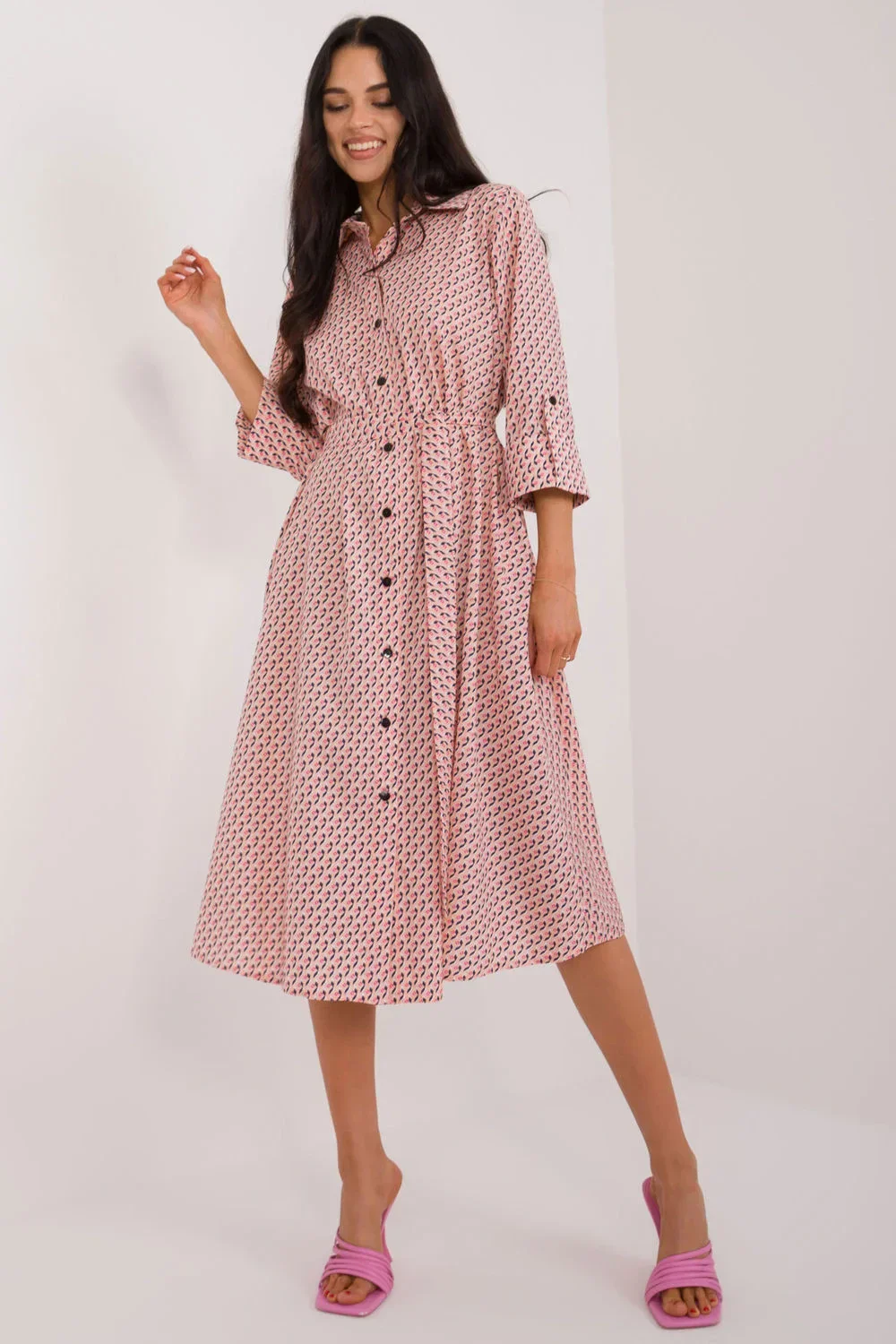 Košilové šaty ideální pro každodenní nošení i do práce. Díky rozšířenému střihu a midi délce jsou pohodlné a elegantní. Tlumený potisk a hlavní materiál polyester jim dodávají univerzální charakter. Tříčtvrteční rukávy a límeček dodávají šatům noblesu, zatímco knoflíky a pásek na zavázání zdůrazňují ženskou siluetu. Díky nakládaným kapsám jsou navíc šaty praktické a funkční pro každodenní nošení.