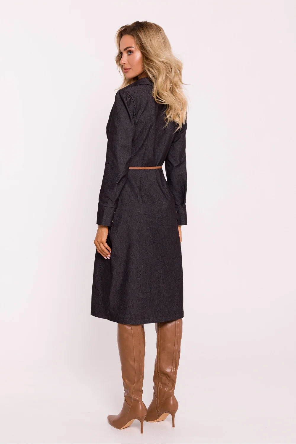 Šaty s košilovým střihem, vyrobené z vysokokvalitní bavlněné látky. Model s klasickým límcem a předem zapínajícím se po celé délce, což jí dodává univerzálnost a styl. Dlouhé rukávy s manžetami zapínajícími se na dva knoflíky zdůrazňují elegantní charakter šatů. Délka po kolena a přiložený pásek umožňují individuální přizpůsobení siluetě. Šaty jsou nevyztužené, lehké a prodyšné. Navrženy a ušity v Polsku, kombinují pohodlí a styl, ideální na různé příležitosti.