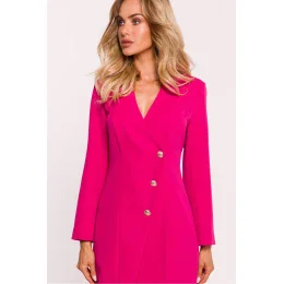 Sakoové šaty s límcem vytvořené z elegantní látky nabízejí unikátní spojení klasiky a moderního stylu. Nesednou střih zajišťuje volný, uvolněný střih, ideální pro každodenní a více formální příležitosti. Dlouhé rukávy a dekorativní zlaté knoflíky vpředu, které nelze rozepnout, dodávají šatům styl a eleganci. Vzadu je skrytý zip, který usnadňuje oblékání a sundávání. Šaty mají délku nad koleno a nemají podšívku, což z nich dělá lehké a pohodlné. Navrženo a ušito v Polsku, kombinuje nejvyšší kvalitu zpracování s moderním designem.