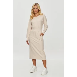 Dresové šaty jsou volným, sportovním kouskem o midi délce, ideální na každý den. Horní část má volný střih a dlouhé raglanové rukávy, které zdůrazňují uvolněný a sportovní charakter. Výstřih je zaoblený, jednoduchý a decentní, což odpovídá celkovému minimalistickému stylu šatů. V pasu je široký elastický pás, který zdůrazňuje siluetu a přidává ženský akcent k tomuto jednoduchému střihu. Spodek šatů je přímý, tužkový a sahající ke kolenům. Tento střih poskytuje pohodlí a zároveň zdůrazňuje ženskou siluetu. Po stranách jsou praktické kapsy, což z nich dělá funkční a pohodlnou volbu. Šaty jsou univerzální a pohodlné, ideální na každodenní nošení. Kombinují sportovní volnost s elegantním minimalismem, což z nich dělá ideální volbu na různé příležitosti, jak do práce, tak na společenské akce. Bavlna 95 %