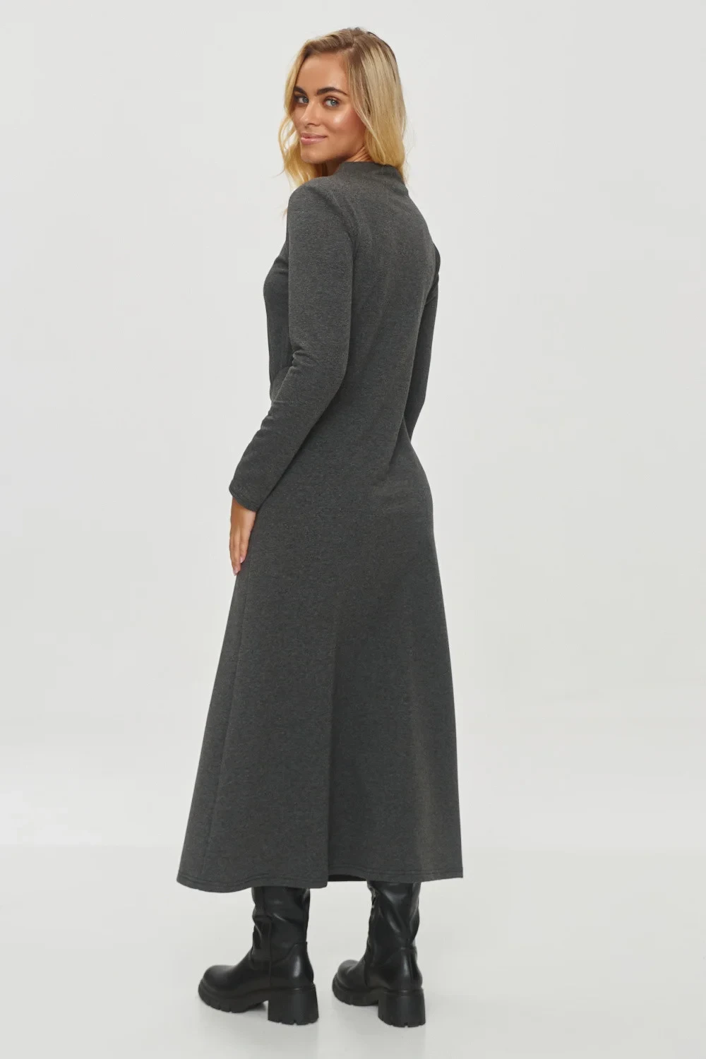 Drapované šaty vytvářejí elegantní a minimalistický návrh, který kombinuje jednoduchost se subtilními detaily. Model má midi délku sahající do poloviny lýtek, co jí dodává eleganci a klasický vzhled. Střih je jednoduchý, ale s efektním akcentem v podobě záhybu na levé straně pasu, který šatě dodává tvar a zdůrazňuje siluetu. Model má dlouhé rukávy, které zajišťují pohodlí a dělají z něj vhodný model na chladnější dny. Vysoký límec dodává šatě eleganci, zatímco ji udržuje v casual stylu. Drapování v oblasti pasu je jemný detail, který jí dodává dynamiku a lehkost, jemně zdůrazňující ženské tvary. Díky neutrálním barvám lze šaty snadno kombinovat s různými doplňky, jak v elegantním, tak i více casual stylu. Model je ideální pro ženy, které ocení pohodlí, jednoduchost, ale zároveň nevzdávají se ženského stylu. Můžete ji zkombinovat se sportovní obuví a získat outfit s moderním a sportovním charakterem. Taková stylizace se hodí na každý den, na setkání s přáteli nebo na procházku.