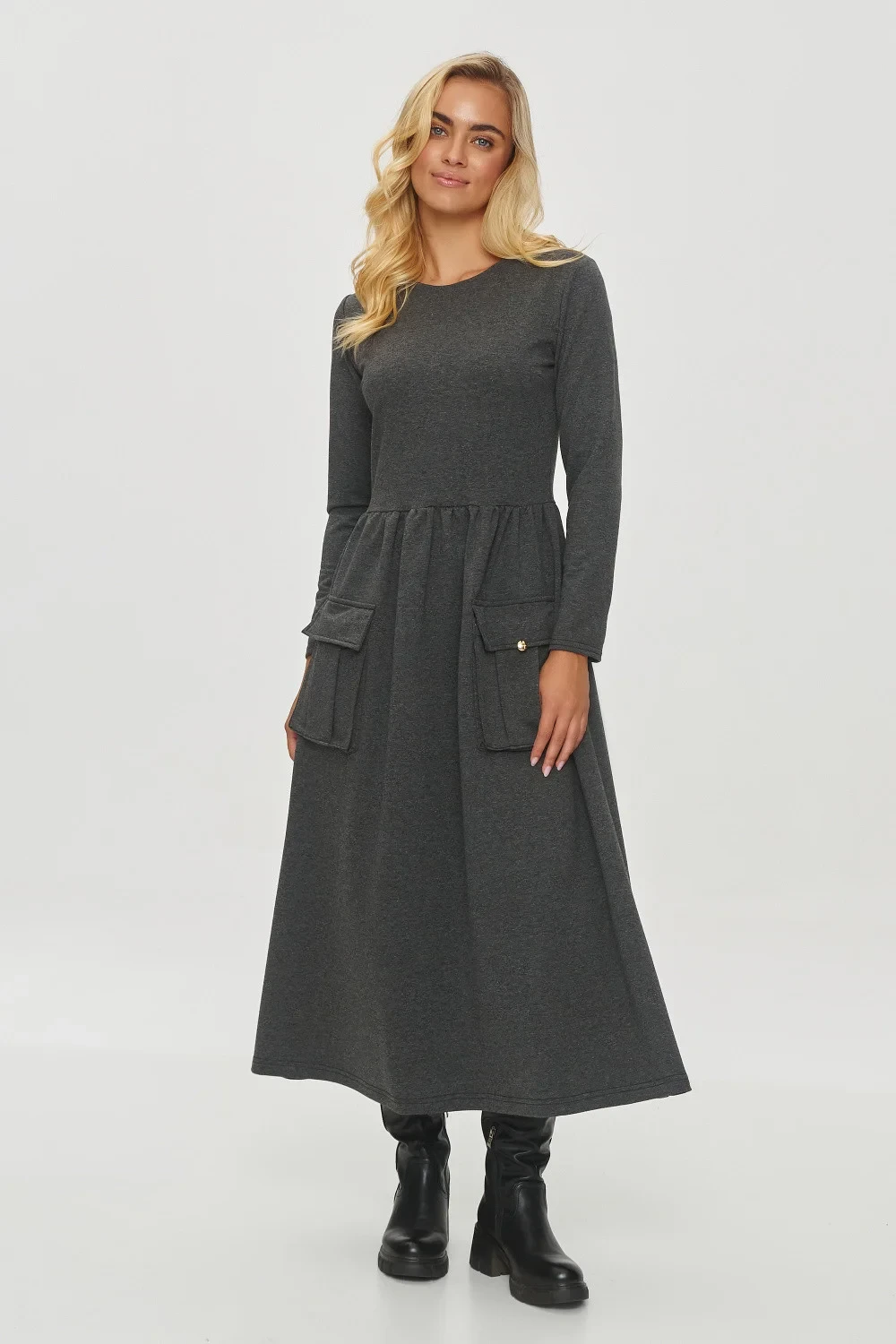 Rozšířené šaty jsou skvělou volbou pro lidi, kteří si cení spojení stylu a funkčnosti. Model má klasický, ženský střih s midi délkou a rozšířeným dnem. Vyrobeno z měkkého, pohodlného materiálu, který se skvěle hodí pro každodenní použití. Šaty mají dlouhé rukávy, co je činí ideální pro chladnější dny. Výstřih v pasu dává efekt jemného mačkání, které zdůrazňuje siluetu a dodává šatům šarm. Charakteristickým prvkem jsou velké, nasazené kapsy vpředu, navíc zdobené elegantním pozlaceným detailom, který nejen přidává styl, ale také plní praktickou funkci. Tento model kombinuje pohodlí a módní design a je ideální volbou pro různé příležitosti.