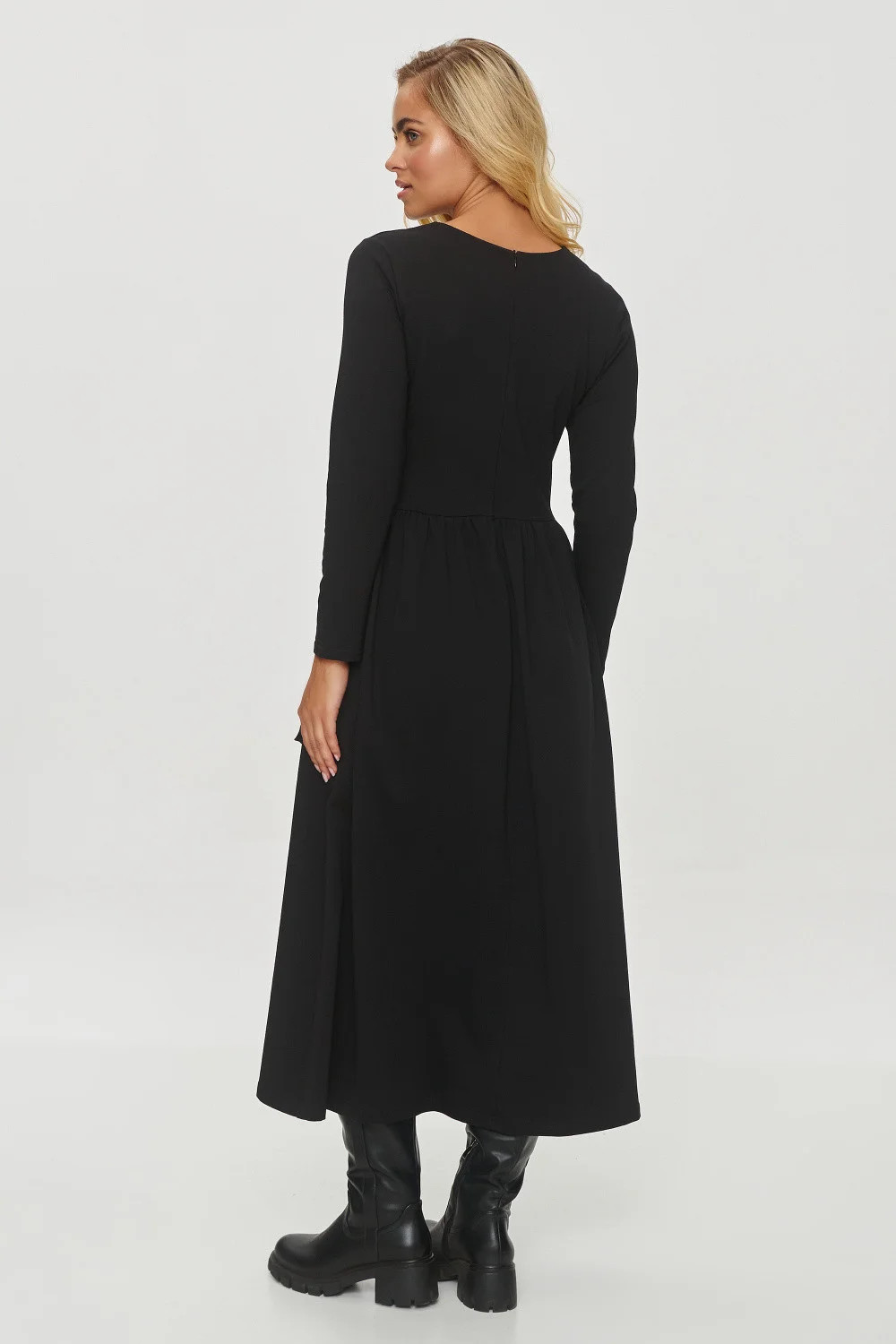 Rozšířené šaty jsou skvělou volbou pro ty, kteří ocení spojení stylu a funkčnosti. Model má klasický, ženský střih midi délky s rozšířeným dnem. Vyrobeno z měkkého, pohodlného materiálu, který se skvěle hodí k běžnému nošení. Šaty mají dlouhé rukávy, což je dělá ideální na chladnější dny. Oddělení v pasu dává efekt subtilních záhybů, které zdůrazňují siluetu a přidávají šatičkám kouzlo. Charakteristickým prvkem jsou velké nasazené kapsy vpředu, navíc zdobené elegantní pozlacovanou ozdobou, které nejen přidávají styl, ale také plní praktickou funkci. Tento model kombinuje pohodlí a módní design, což ho dělá ideální volbou na různé příležitosti.