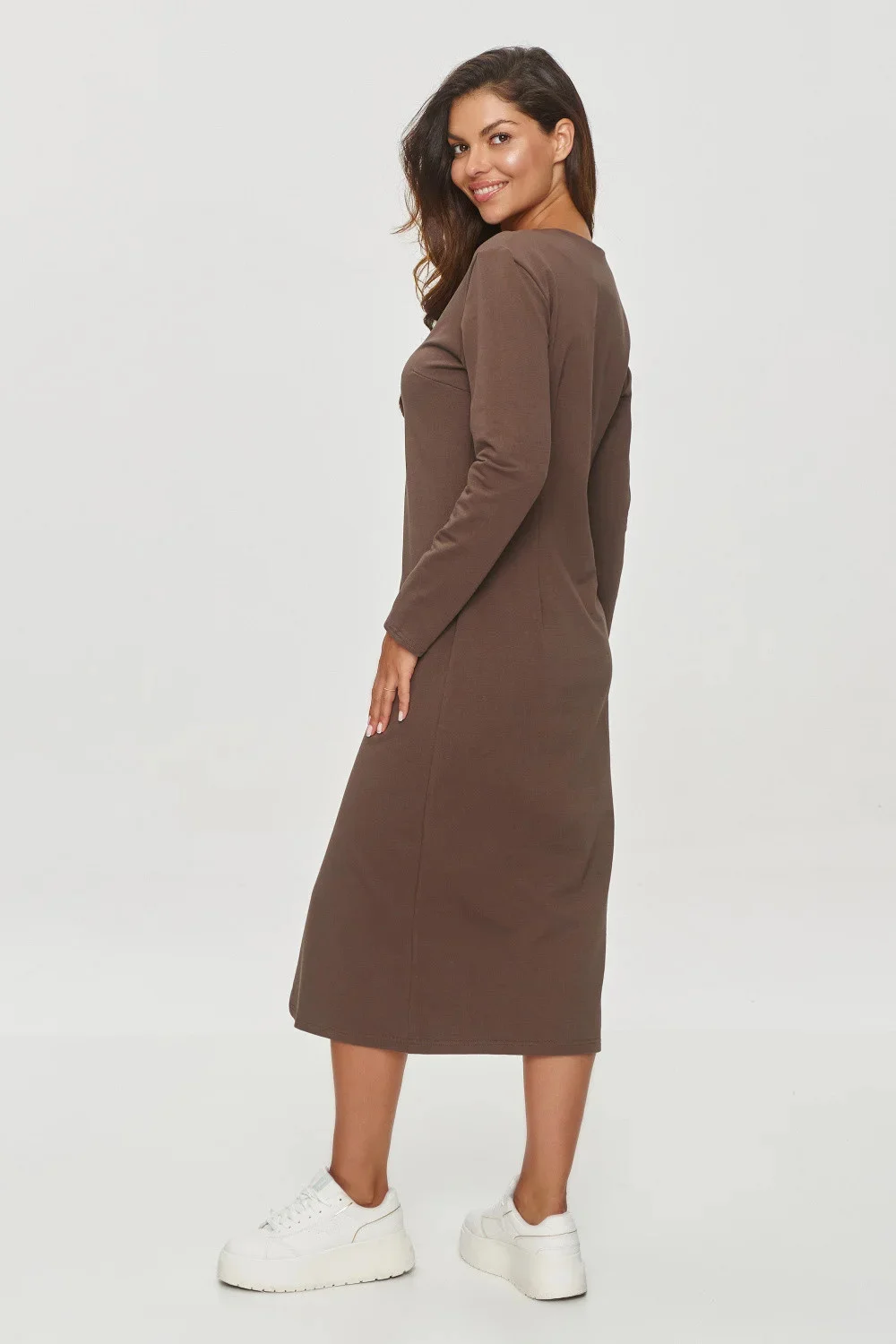 Dresové šaty jsou elegantní, ale zároveň jednoduchý nápad na každý den, který kombinuje minimalismus s trochou stylu. Model má jednoduchý, těsně přiléhající střih, který zdůrazňuje siluetu, ale zároveň zůstává pohodlný. Délka šatů sahá až po polovinu lýtek, což jim dodává klasický charakter. Měkký a elastický materiál zajišťuje pohodlí nošení po celý den. Šaty mají dlouhé rukávy, ideální na chladnější dny. Výstřih má tvar písmene V, který opticky prodlužuje krk a dodává eleganci. Na přední straně šatů je jemné prohloubení dole, které jim dodává lehkost a umožňuje volnost pohybu. Můžete je zkombinovat s bílými teniskami, což dodá celku sportovní, ale stále elegantní vzhled nebo je nosit s kotníkovými botami nebo balerínami, aby se dosáhlo více formálního efektu. Tyto šaty jsou ideální volbou na každodenní vycházky, setkání s přáteli nebo do práce. Díky svému jednoduchému střihu a elegantním detailům je lze snadno stylizovat na různé příležitosti.